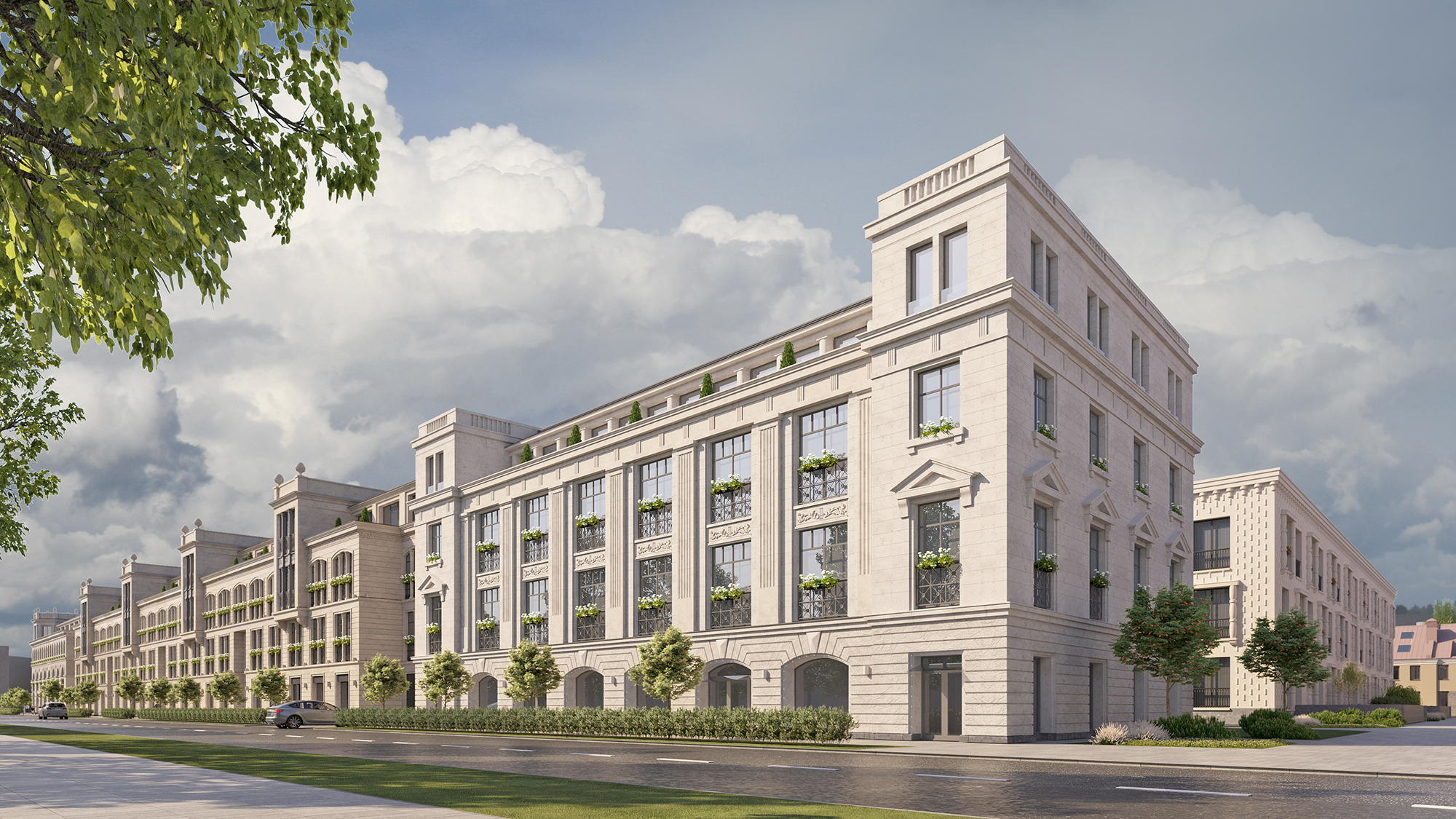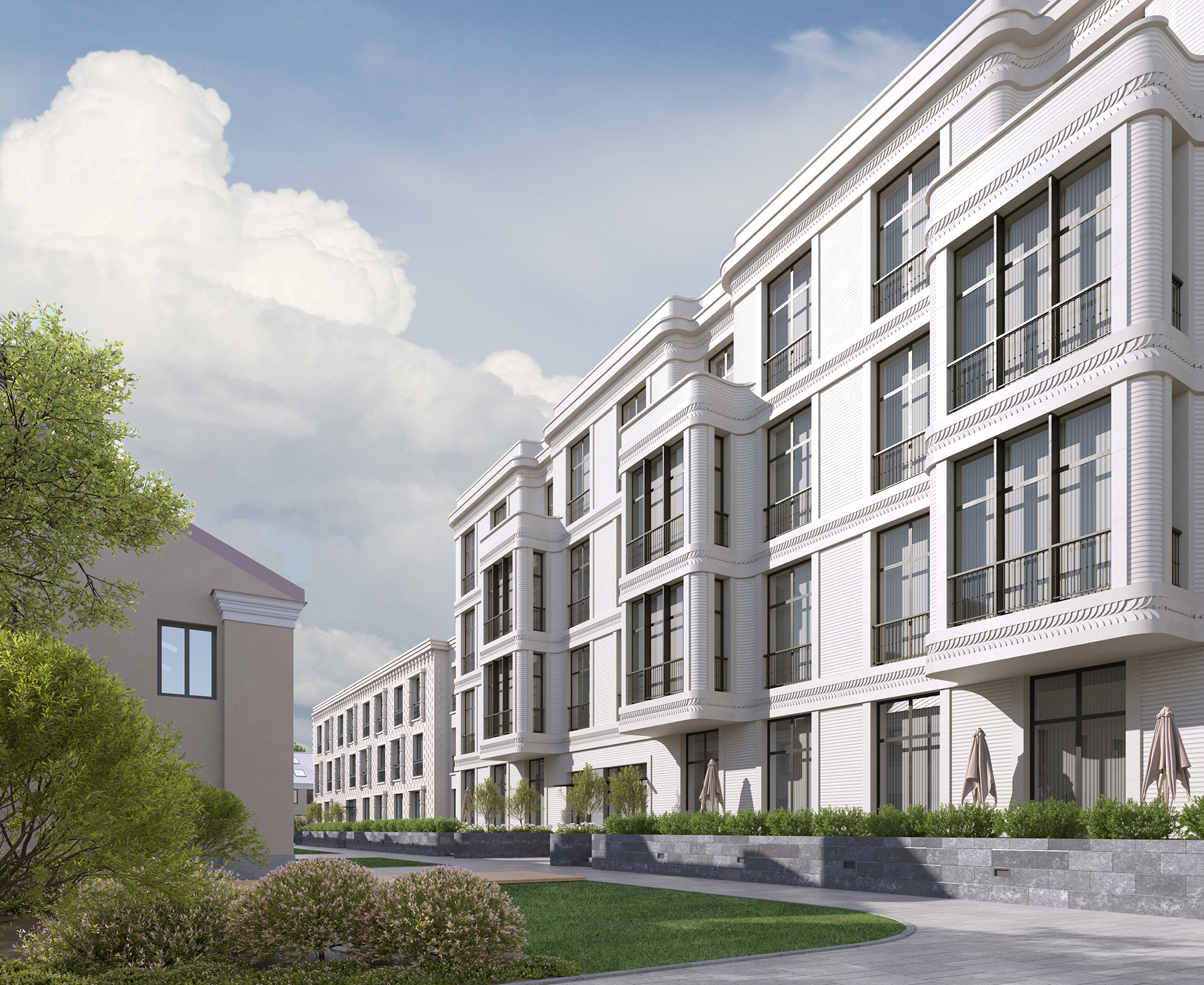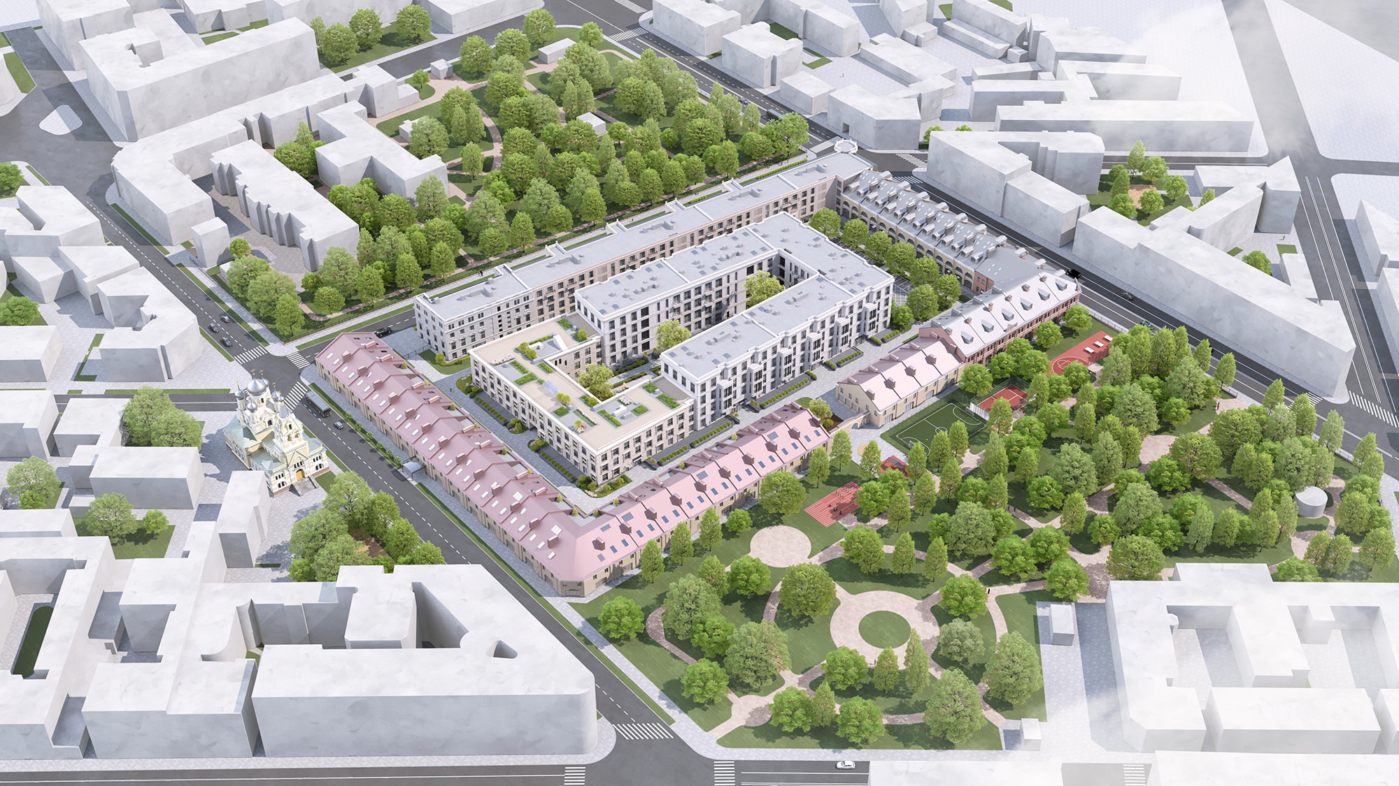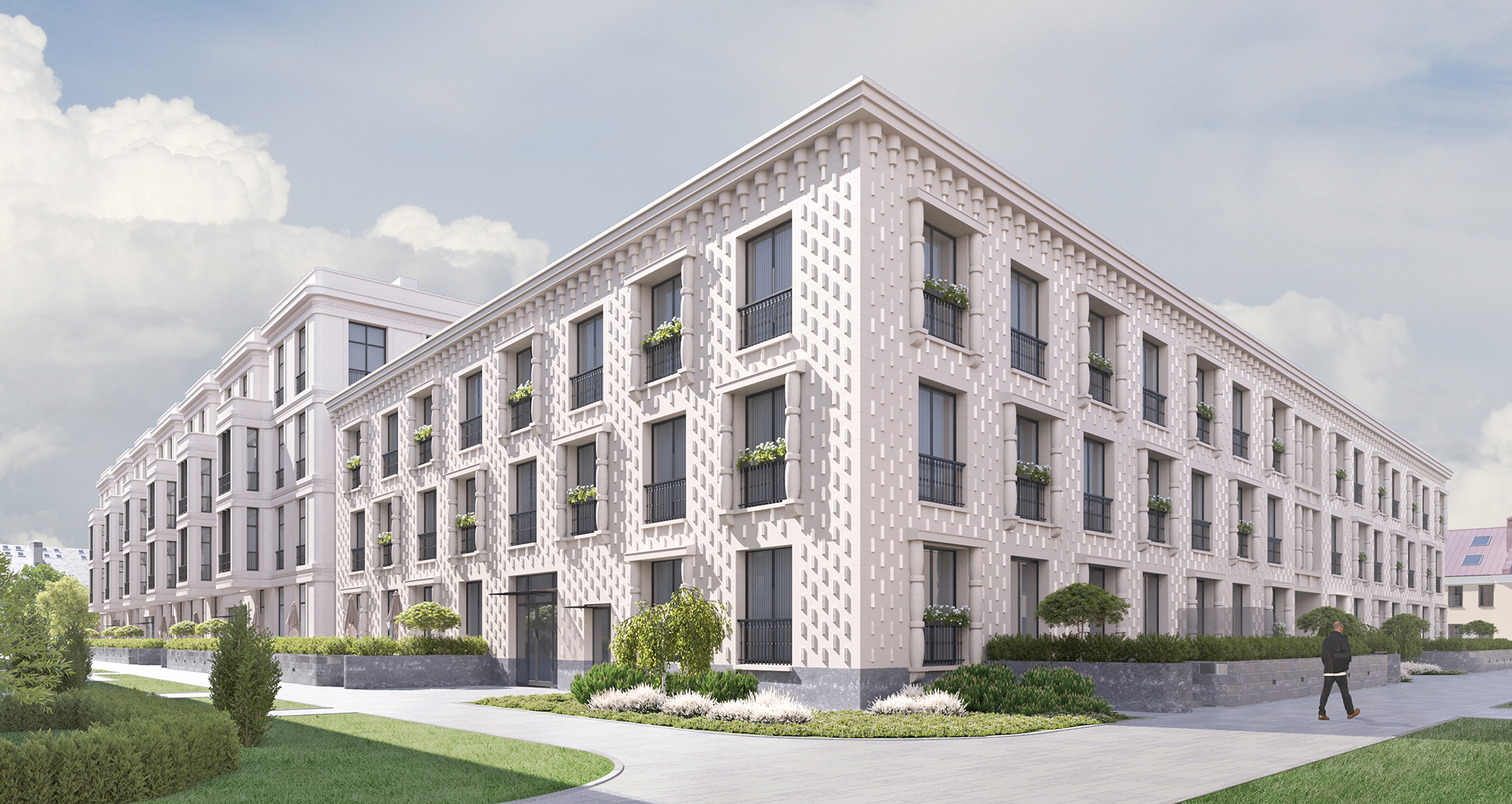 of a residential complex with 300 apartments and a 4-storey maximum height