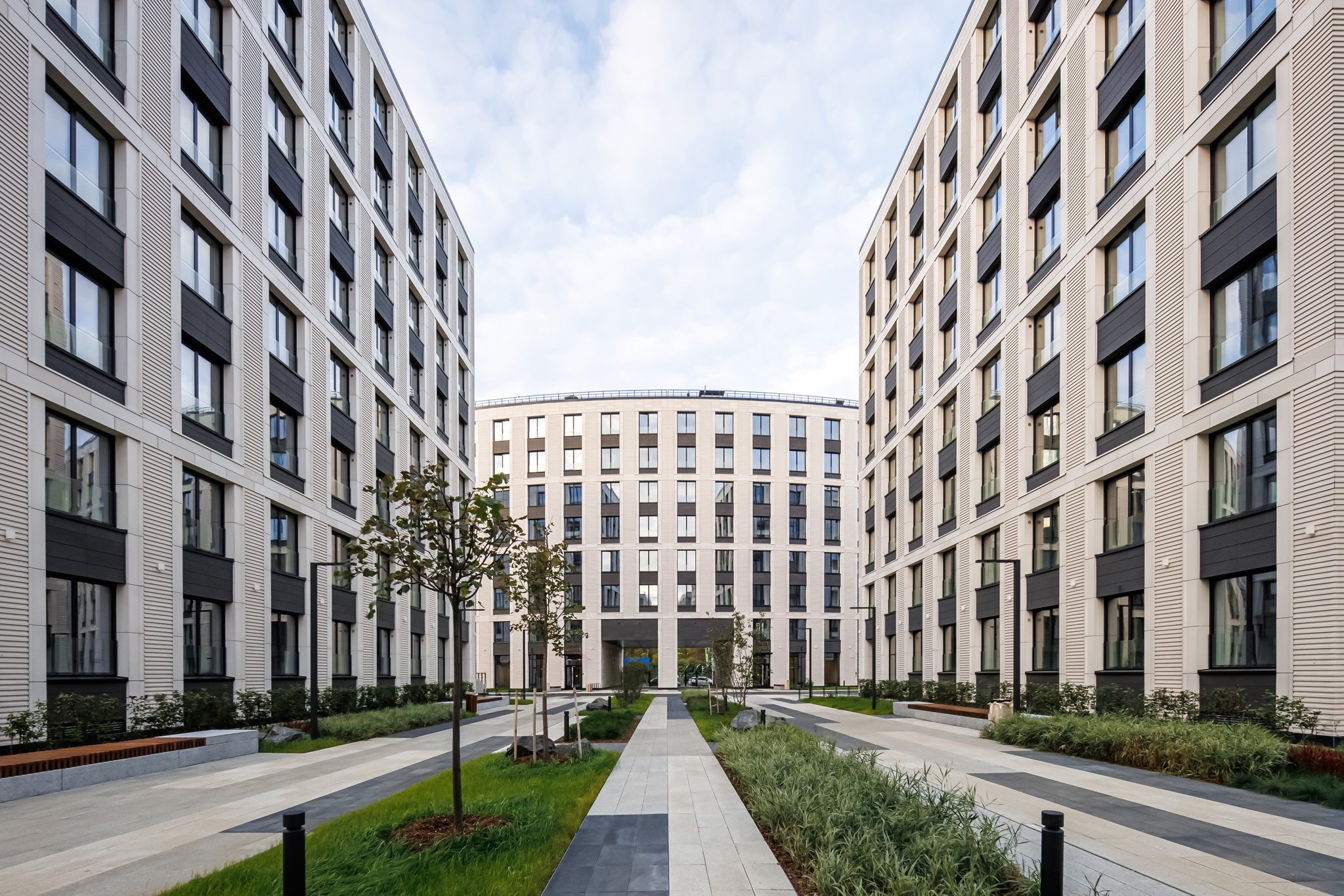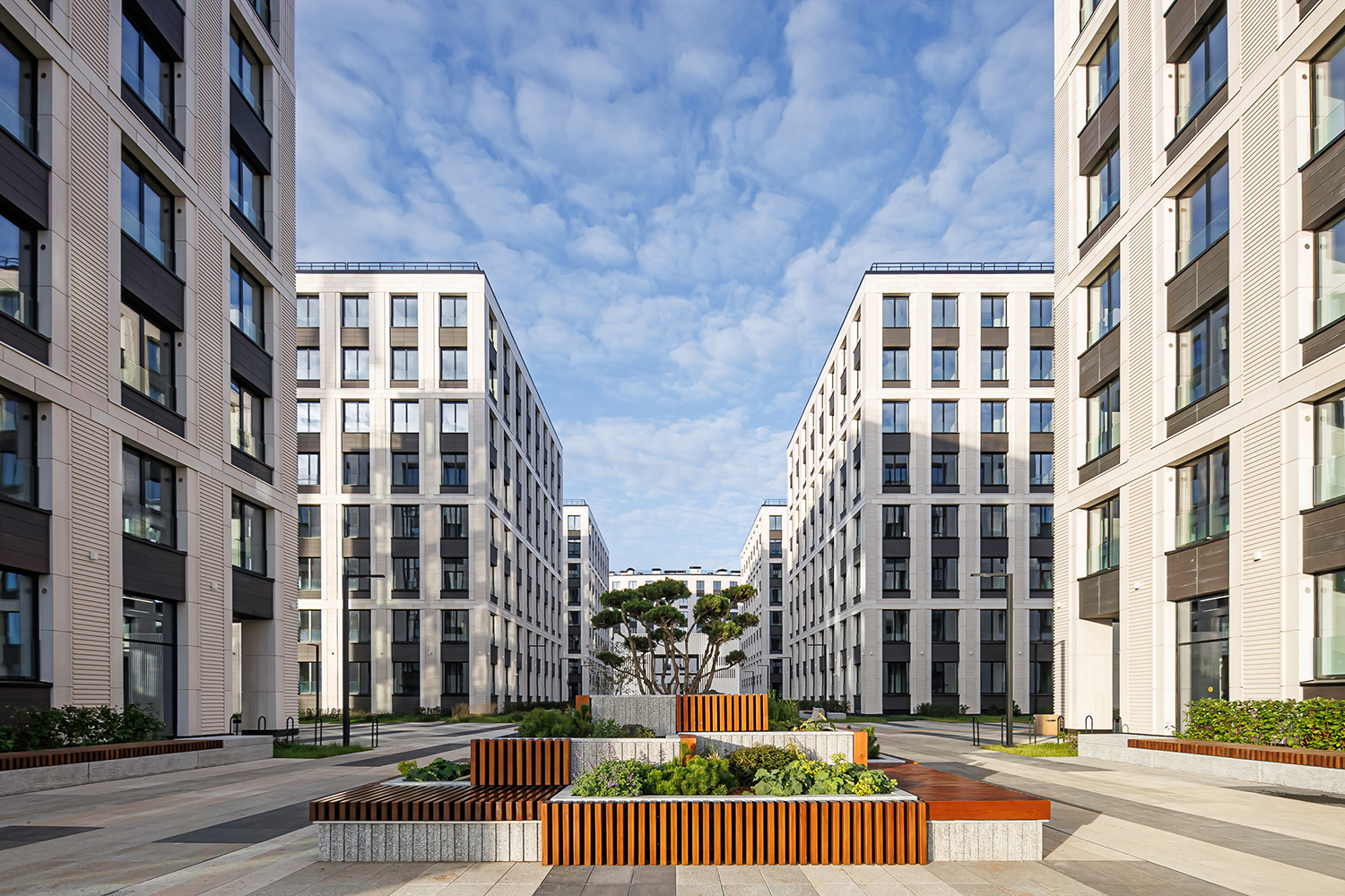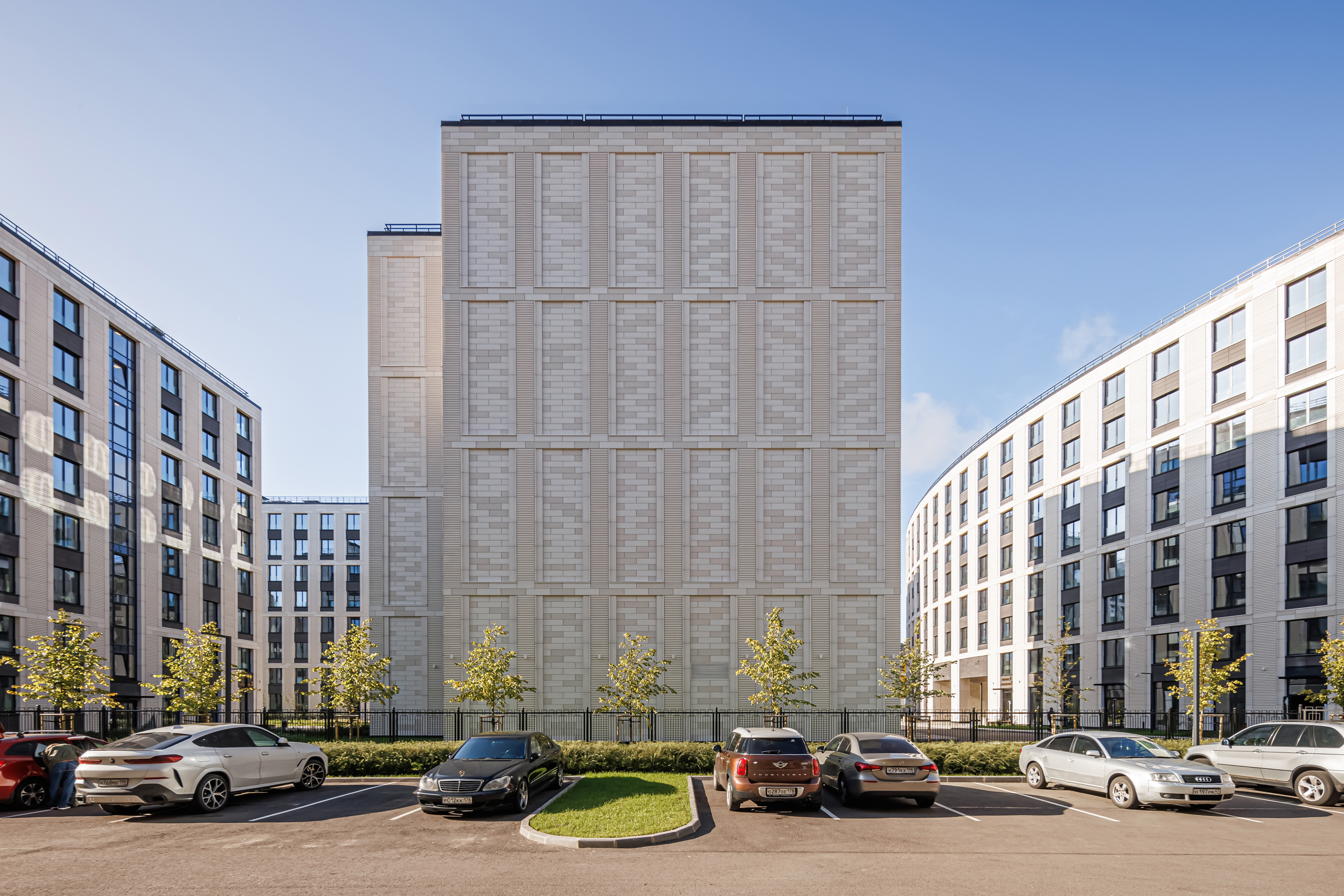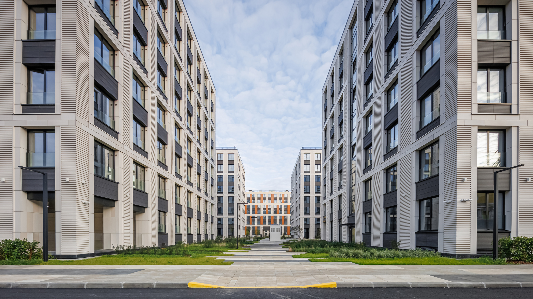 The first two buildings of the residential complex create the frontage line of the Petrovsky prospect and the Petrovskaya square, respectively. There is an inner passage inside the block leading to the water, serving as a centre line: there are six more one-sectional buildings arranged in pairs along the passage.