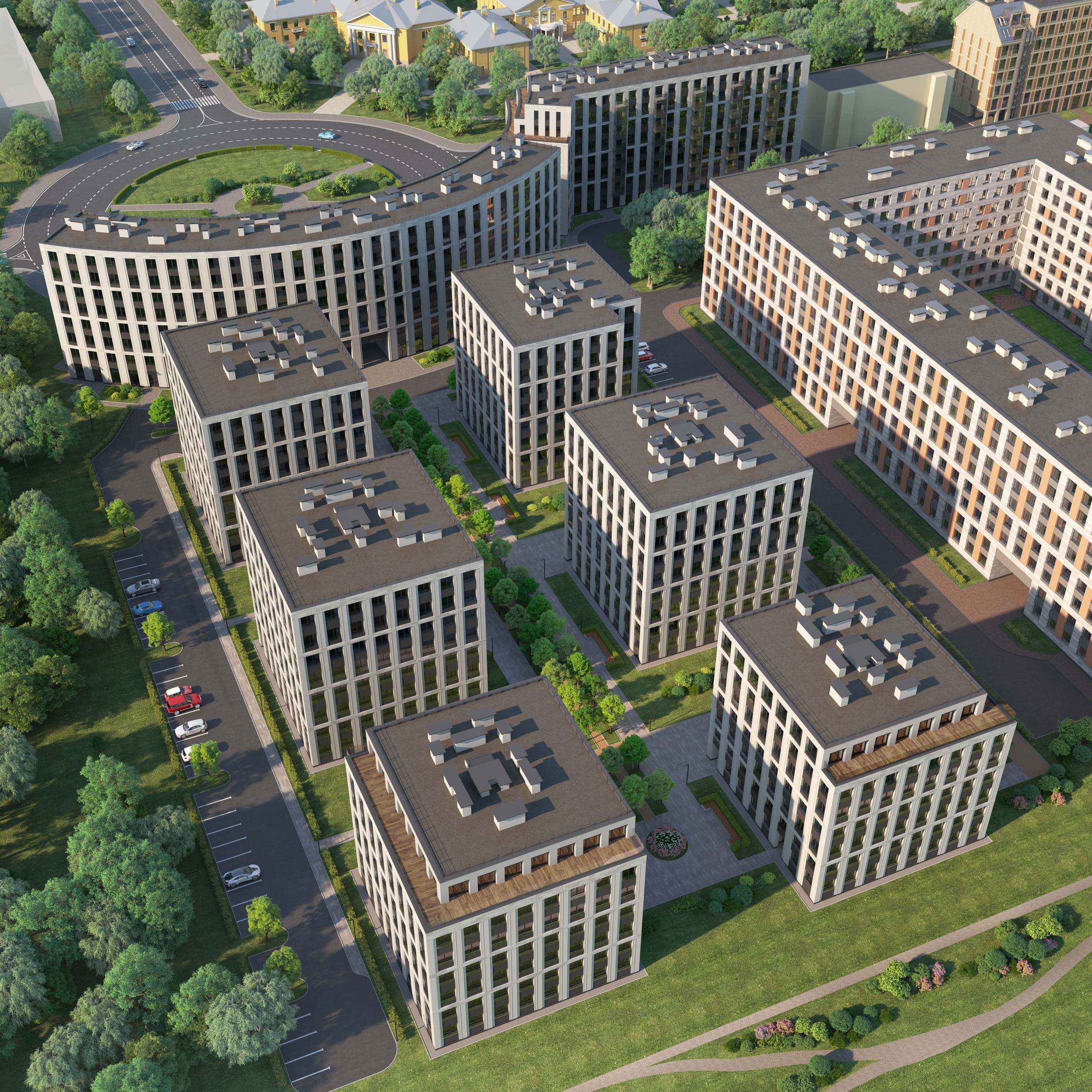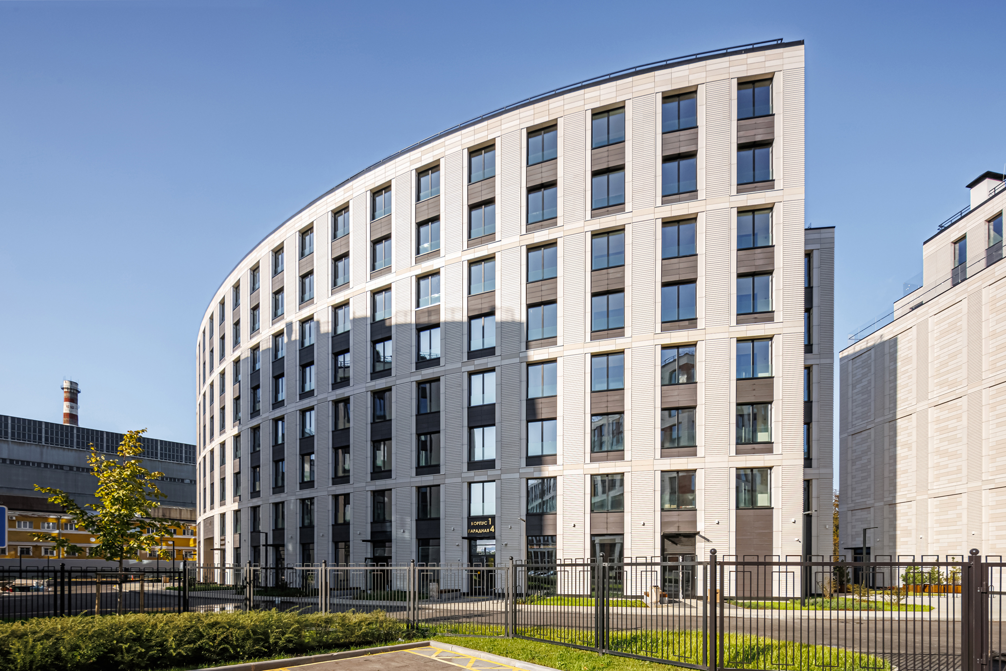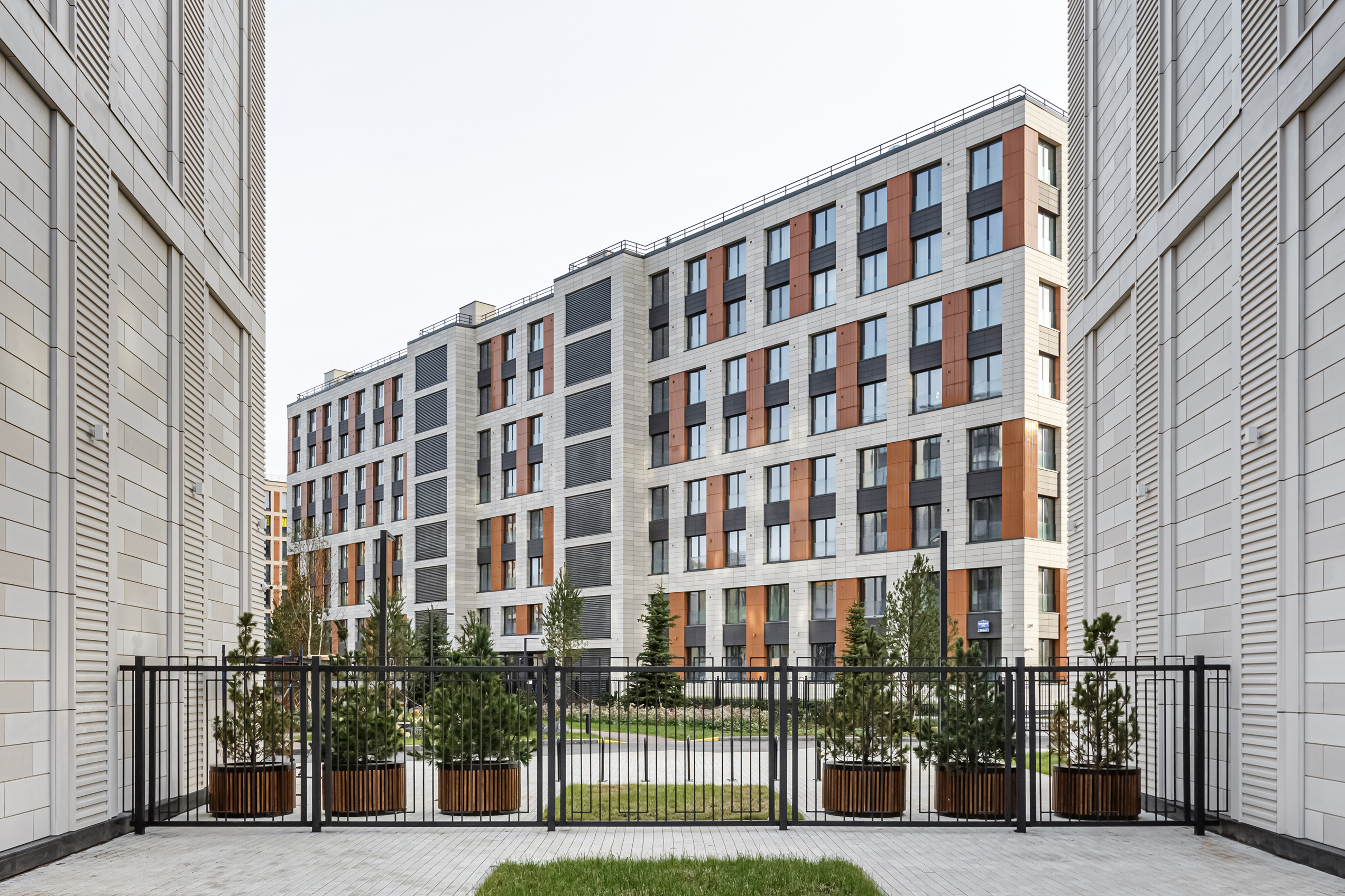 The first two buildings of the residential complex create the frontage line of the Petrovsky prospect and the Petrovskaya square, respectively. There is an inner passage inside the block leading to the water, serving as a centre line: there are six more one-sectional buildings arranged in pairs along the passage.