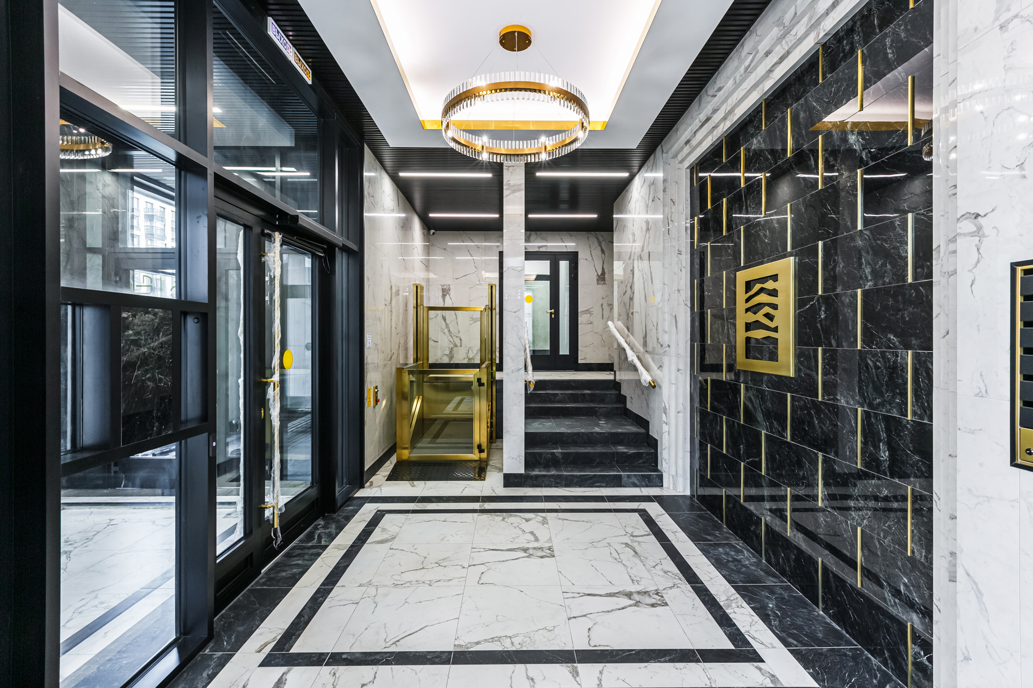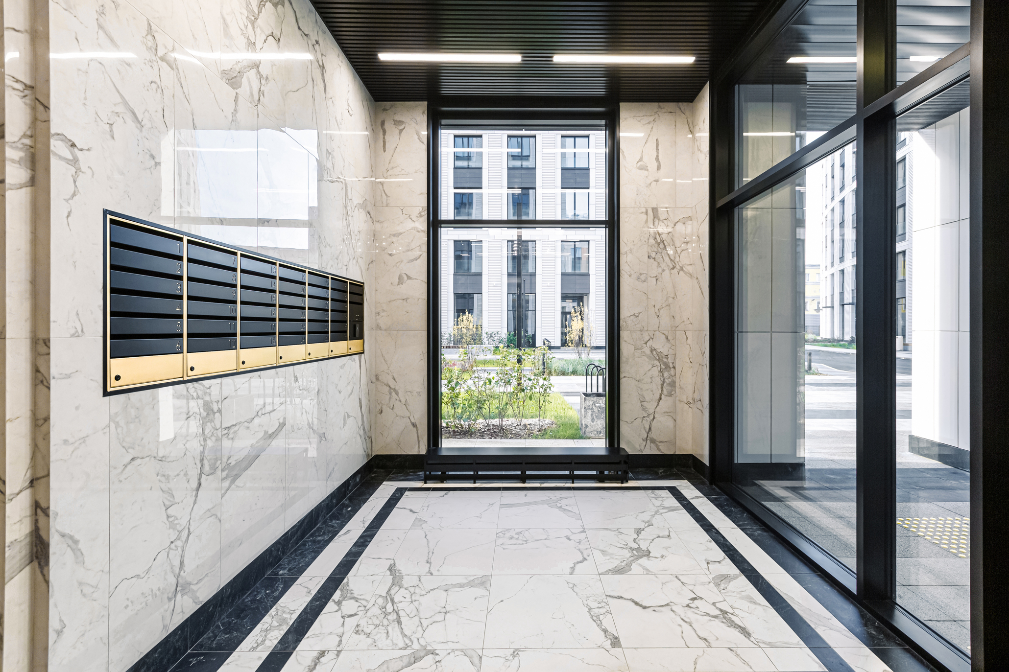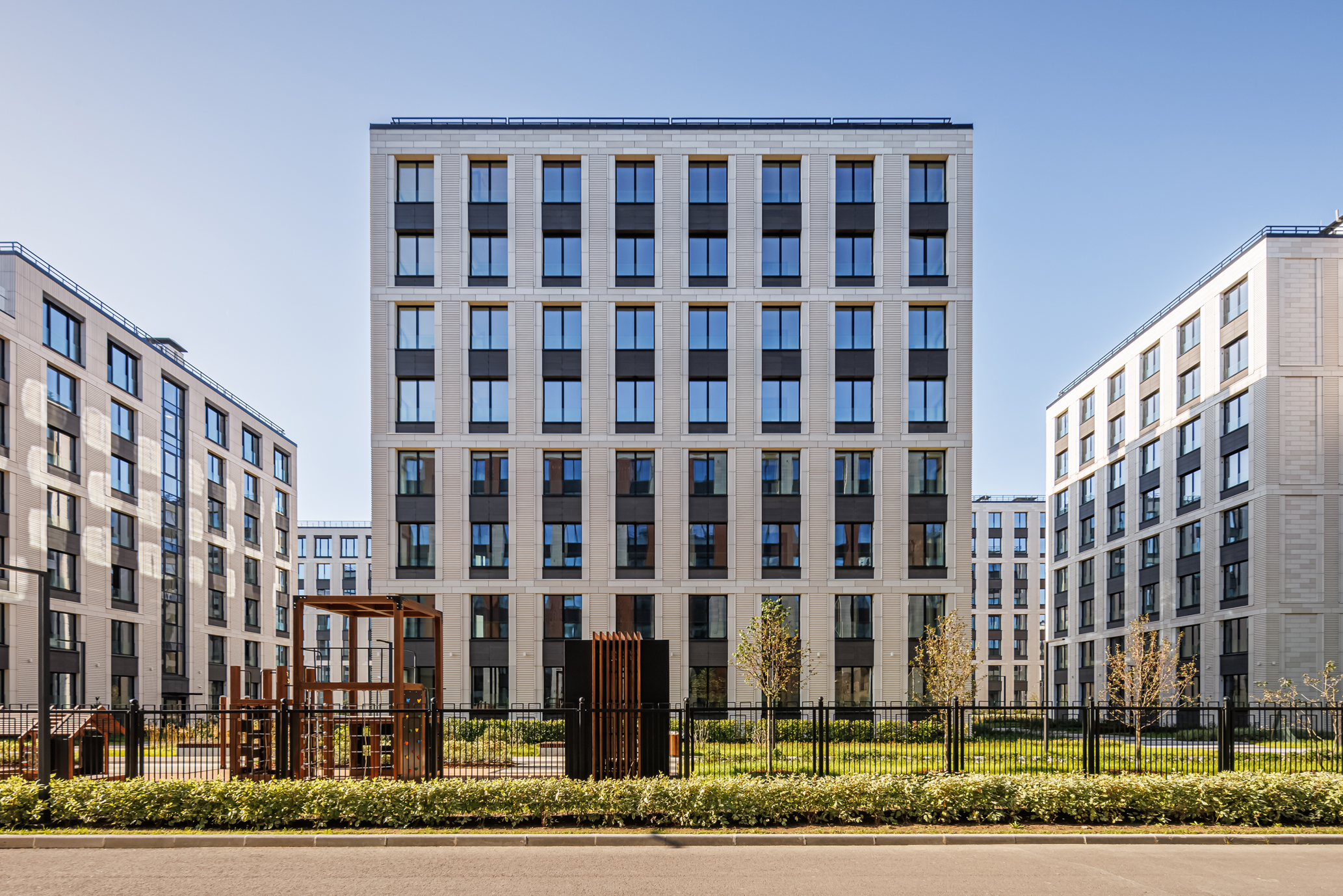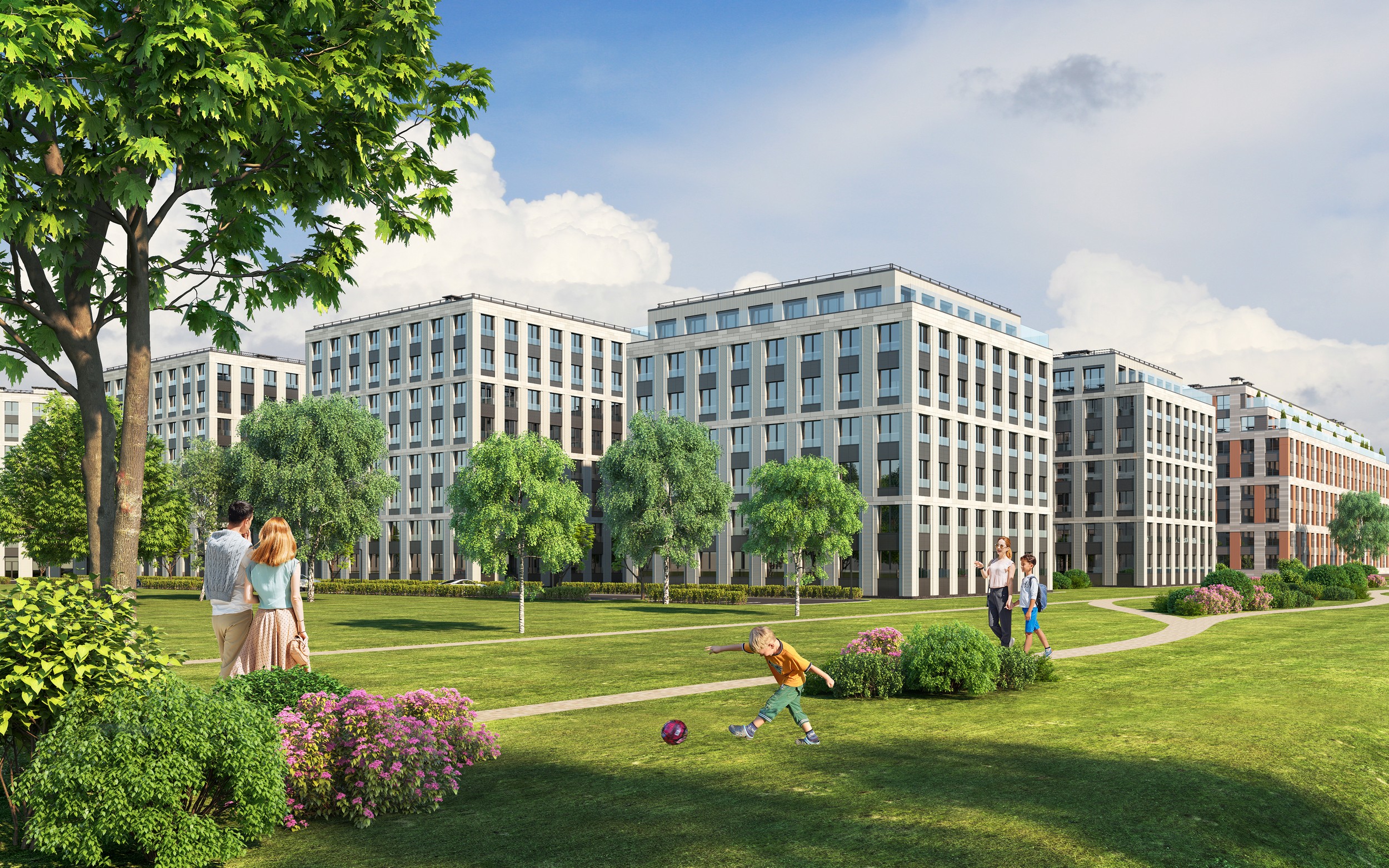 The first two buildings of the residential complex create the frontage line of the Petrovsky prospect and the Petrovskaya square, respectively. There is an inner passage inside the block leading to the water, serving as a centre line: there are six more one-sectional buildings arranged in pairs along the passage.