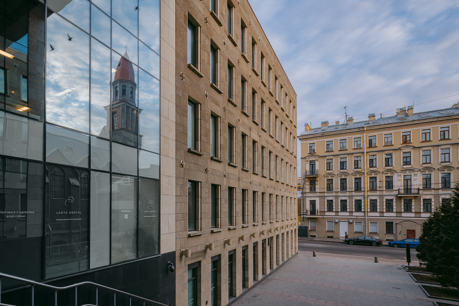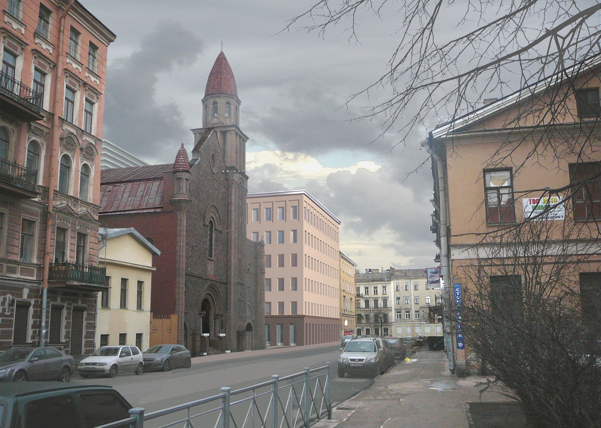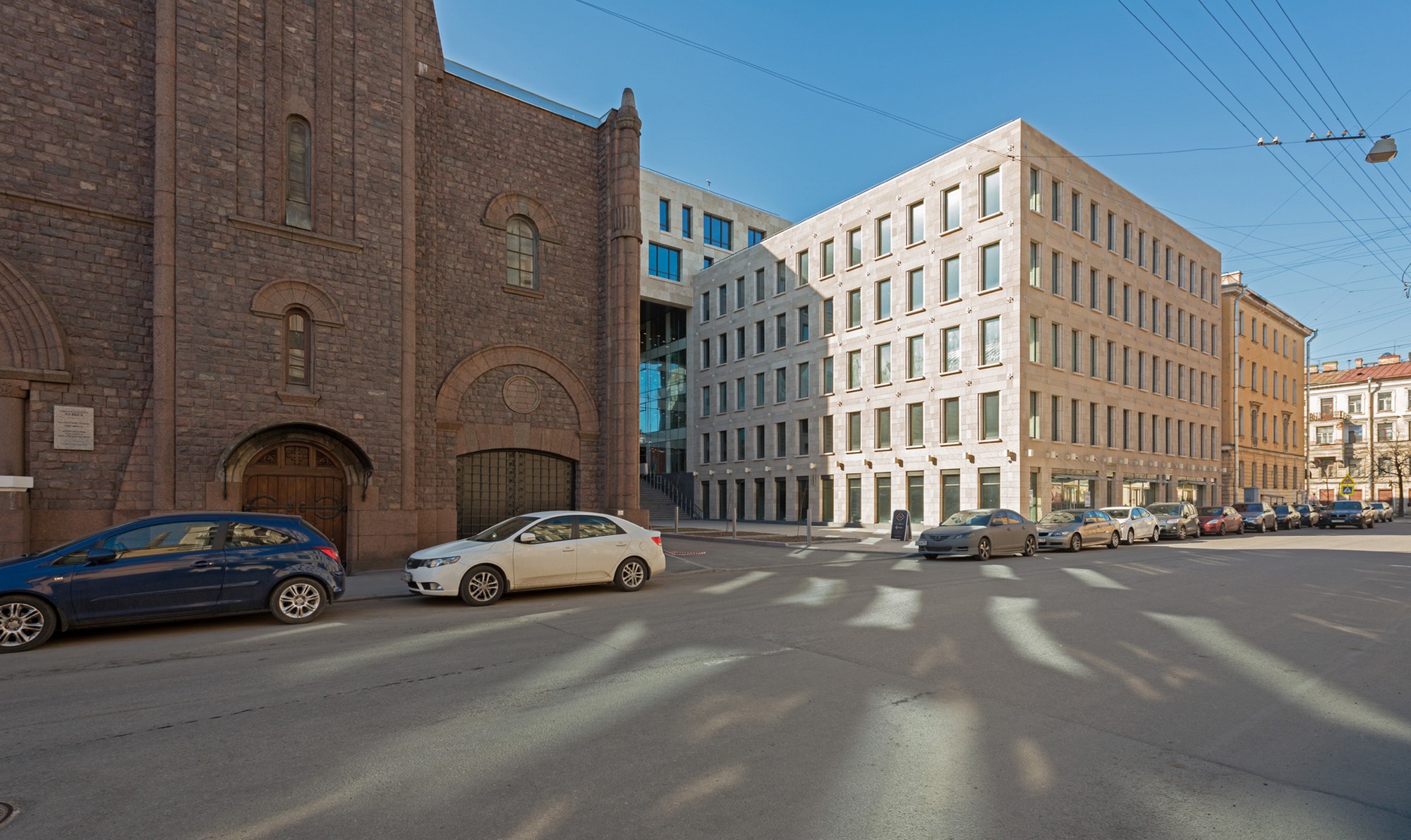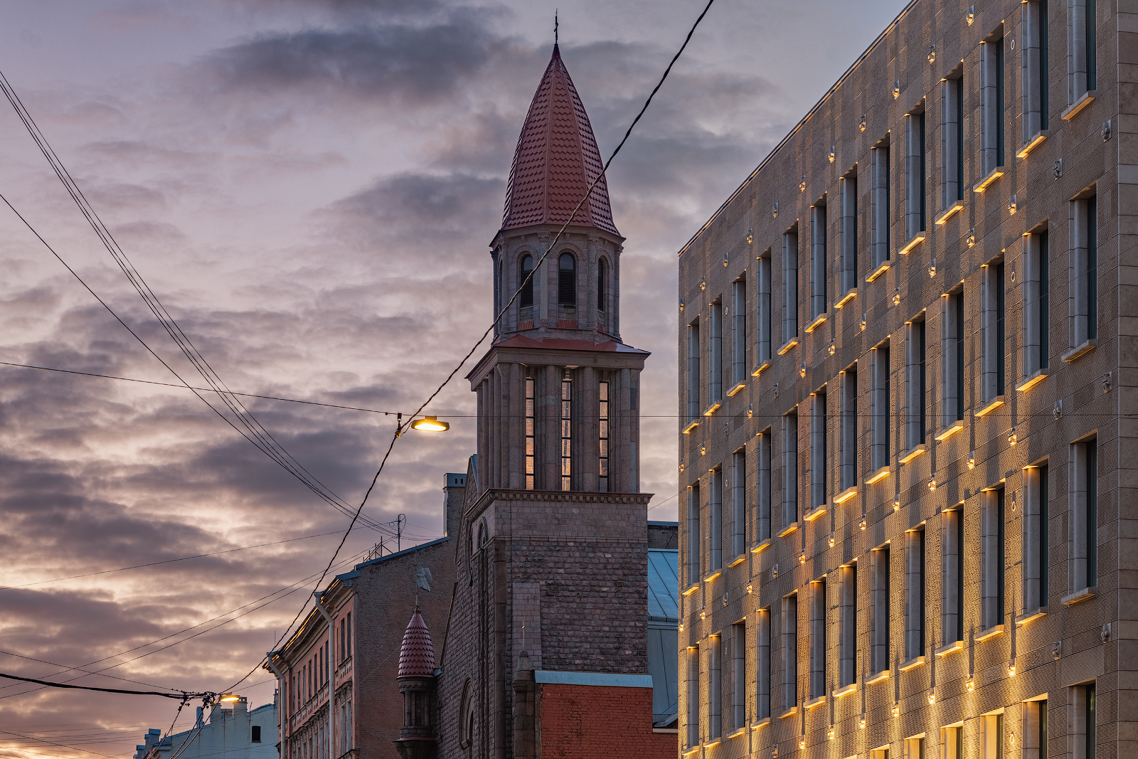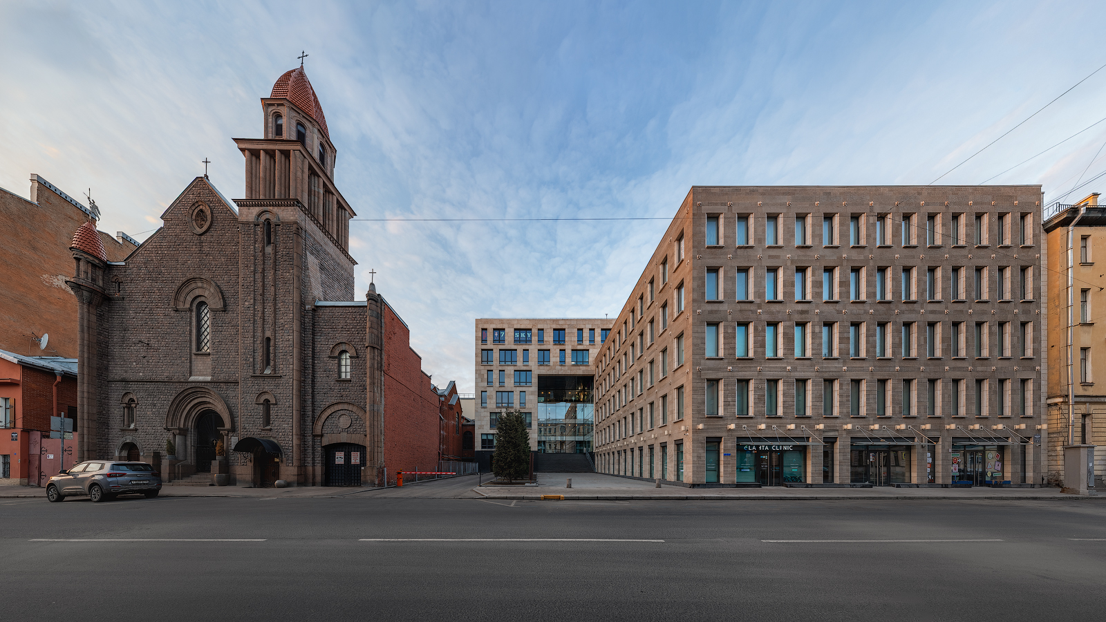 The architectural solution of the object is due to the neighborhood with the church of the Virgin Maid of Lourdes - an architectural monument of federal significance. The appearance of the house is conceived as a quiet background for the church, a kind of setting for a precious stone.
