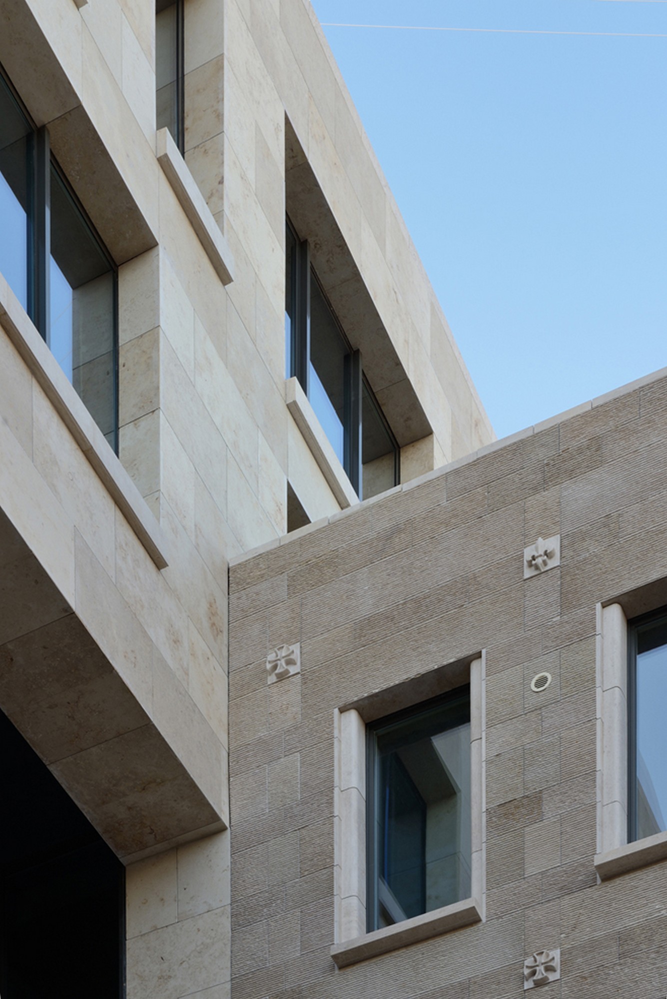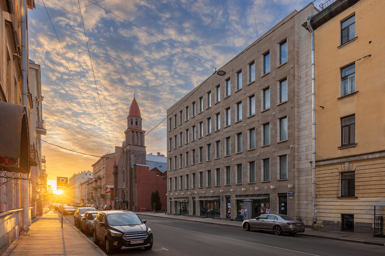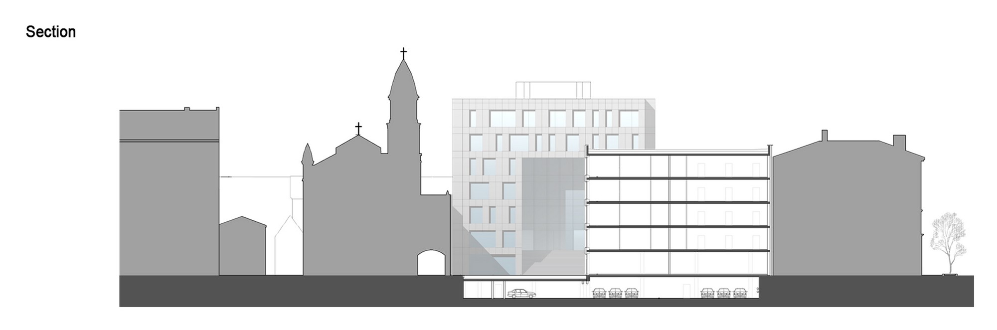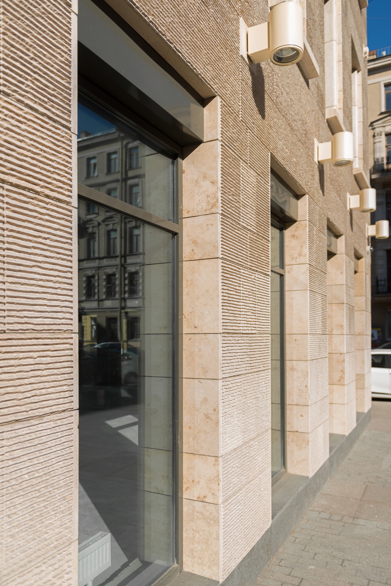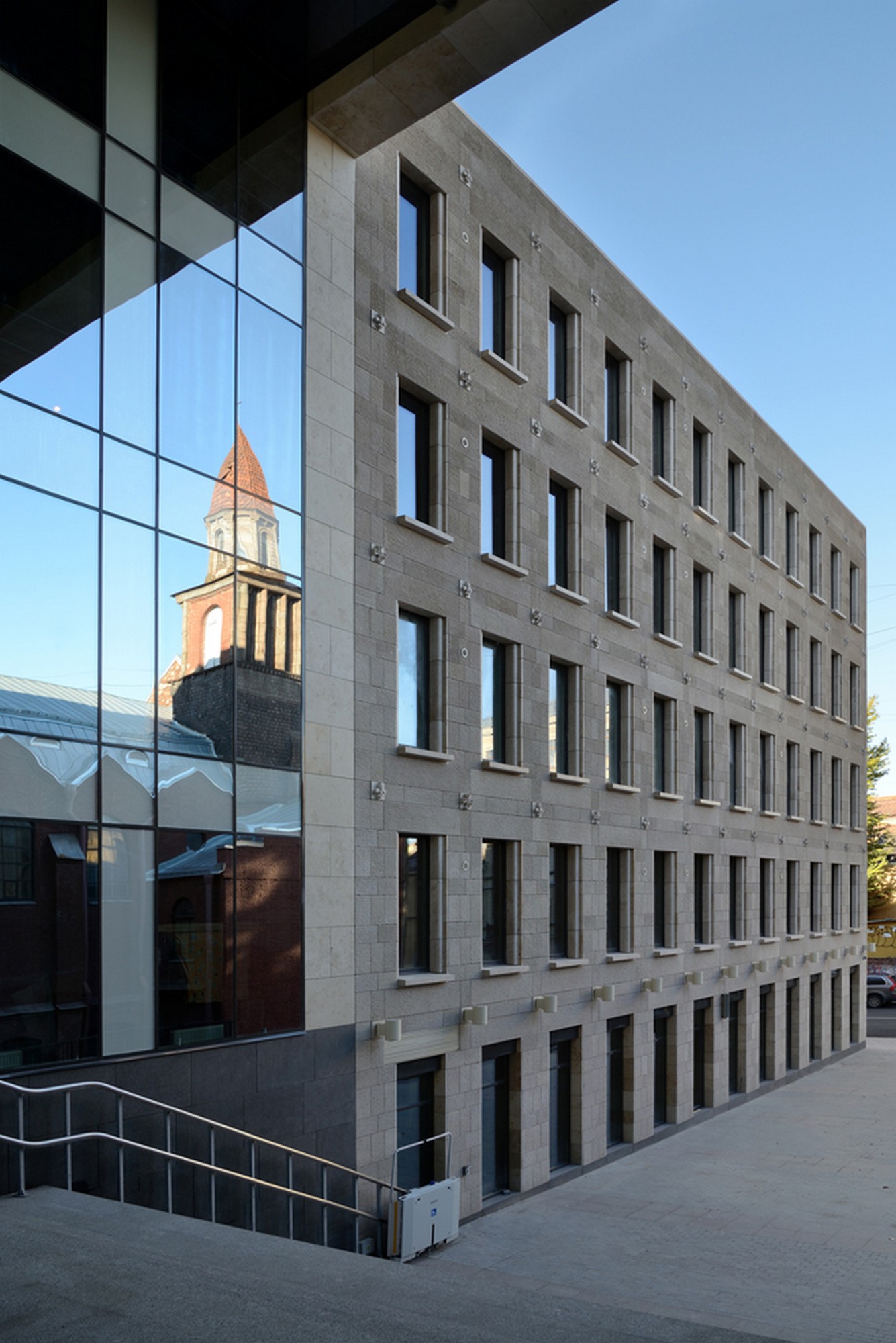 The architectural solution of the object is due to the neighborhood with the church of the Virgin Maid of Lourdes - an architectural monument of federal significance. The appearance of the house is conceived as a quiet background for the church, a kind of setting for a precious stone.