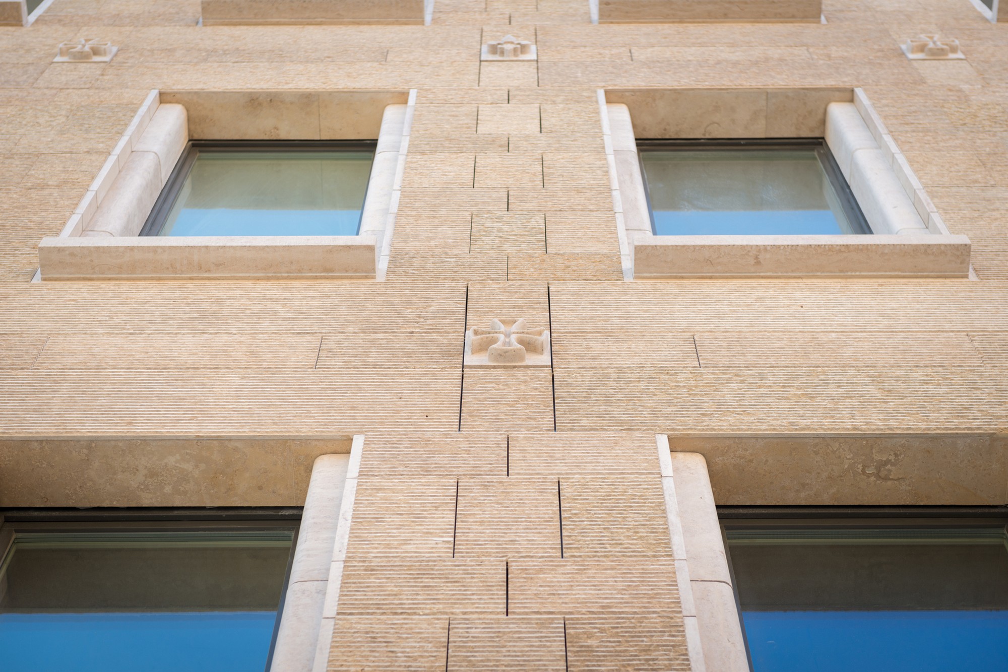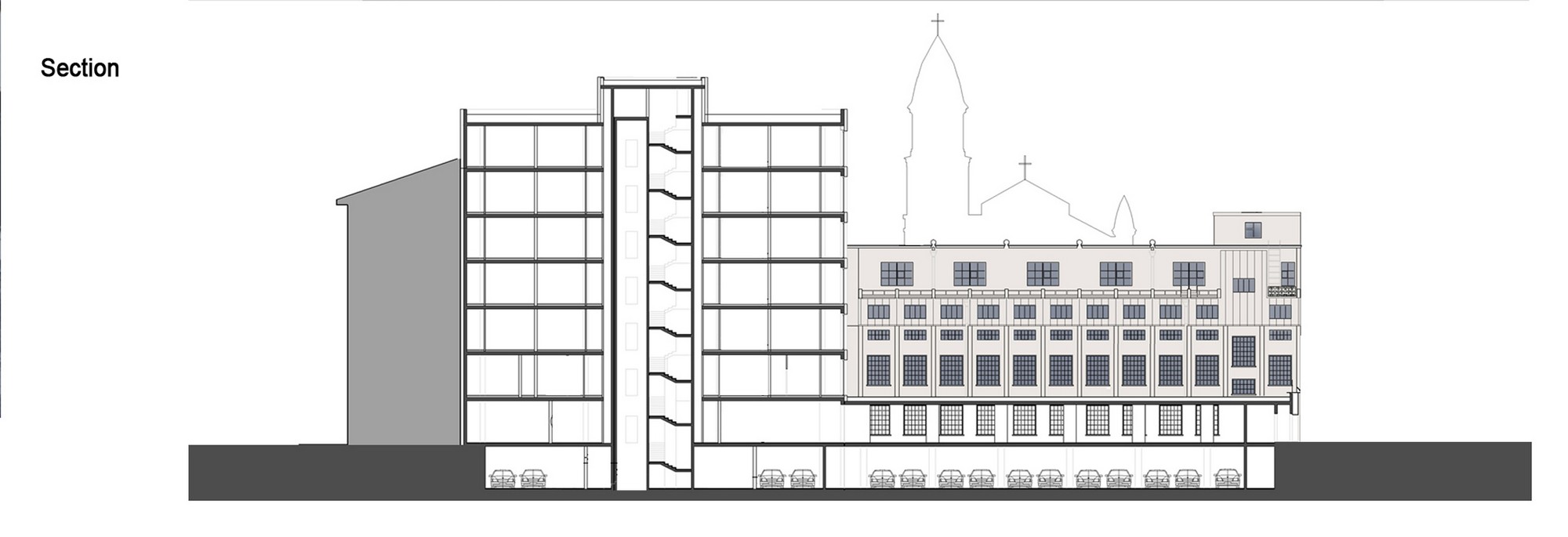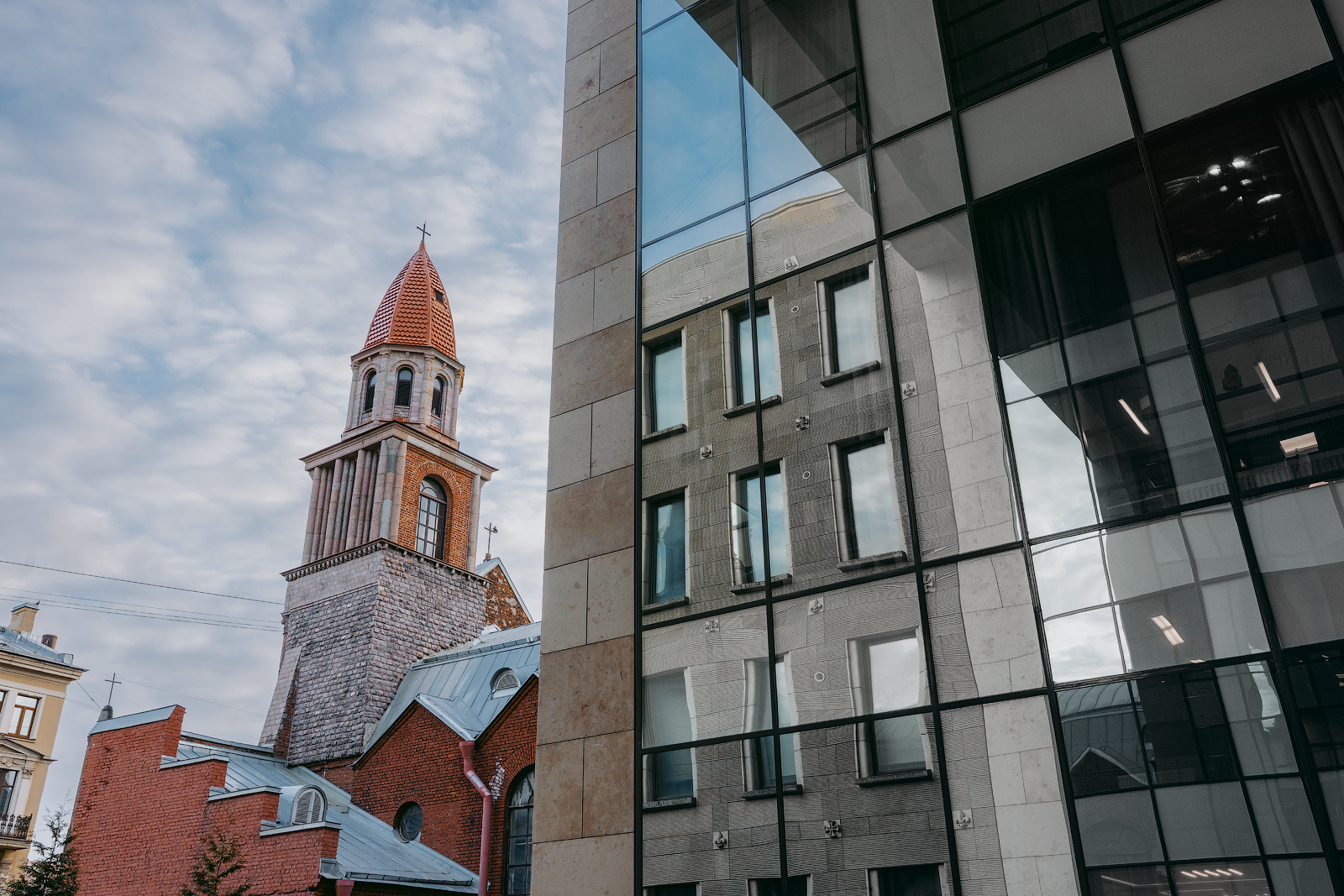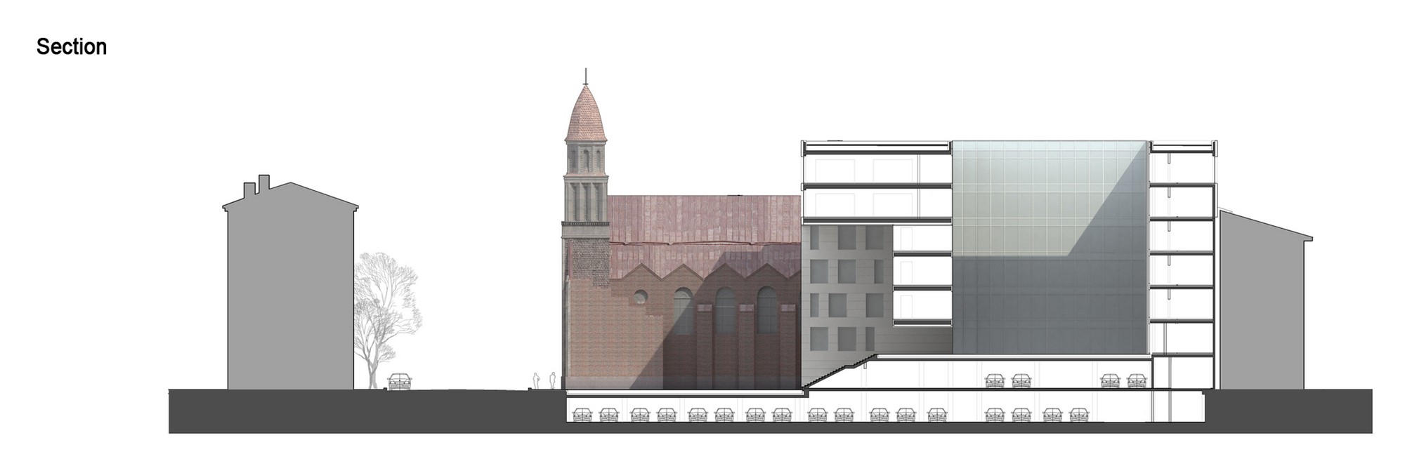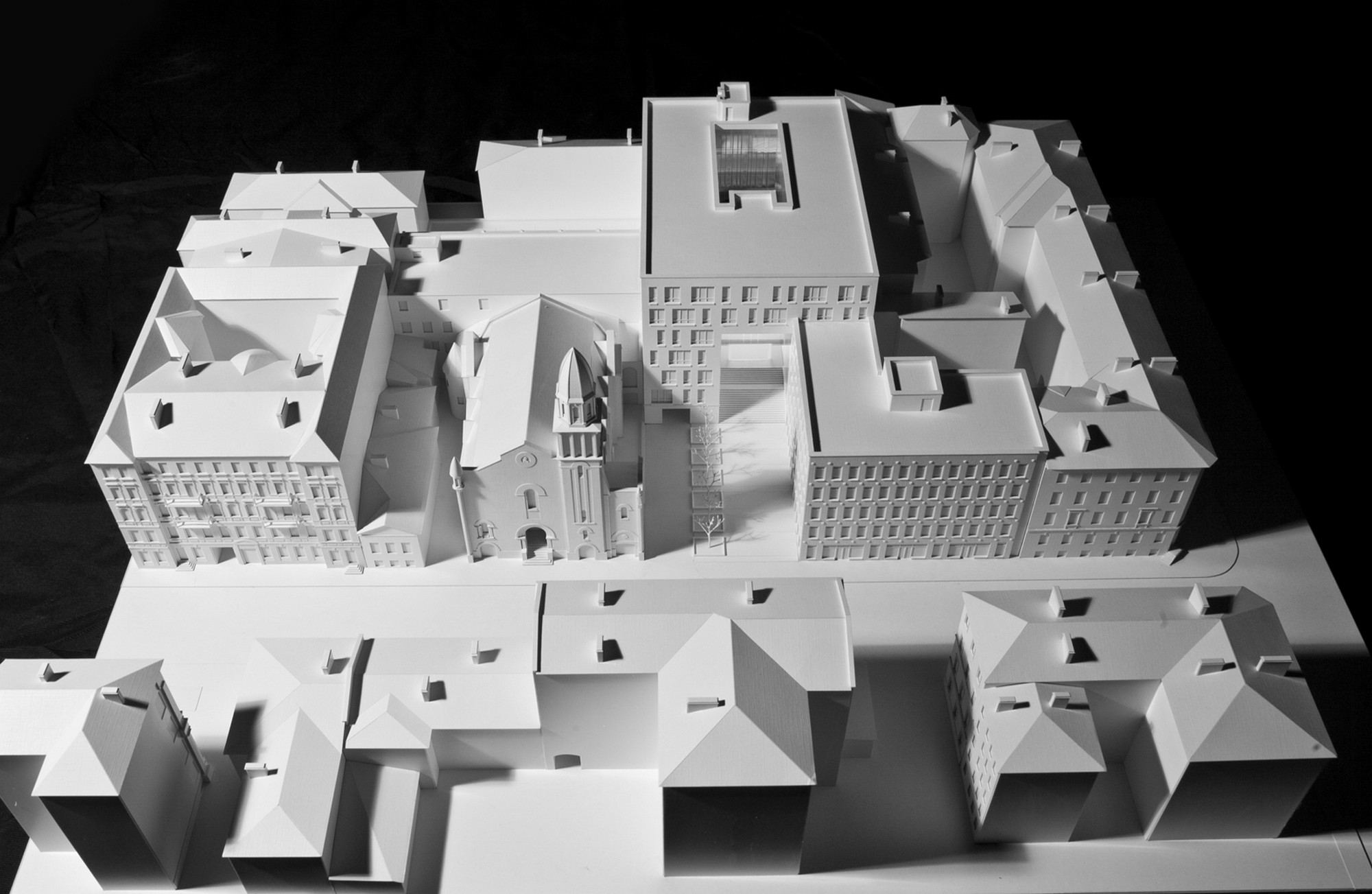 The architectural solution of the object is due to the neighborhood with the church of the Virgin Maid of Lourdes - an architectural monument of federal significance. The appearance of the house is conceived as a quiet background for the church, a kind of setting for a precious stone.
