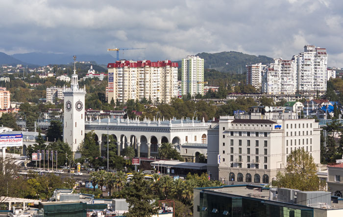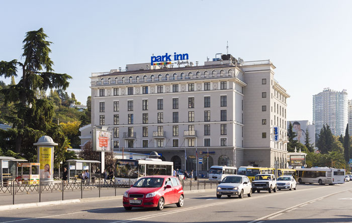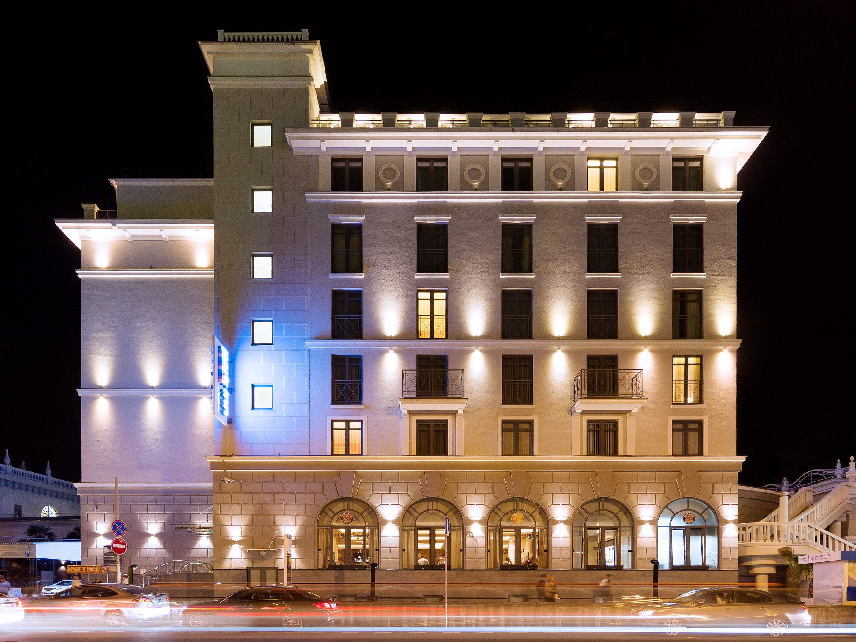 The hotel is built along the traditions of southern coastal architecture . Those are emphasised through an imitation of stonework and large archways on the ground floor façade, a calm rhythm of the windows pattern, balconies, a terrace on the upper floor, and a tiled roof.
