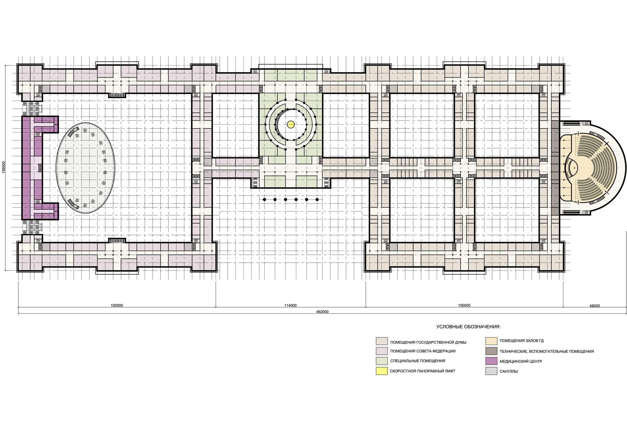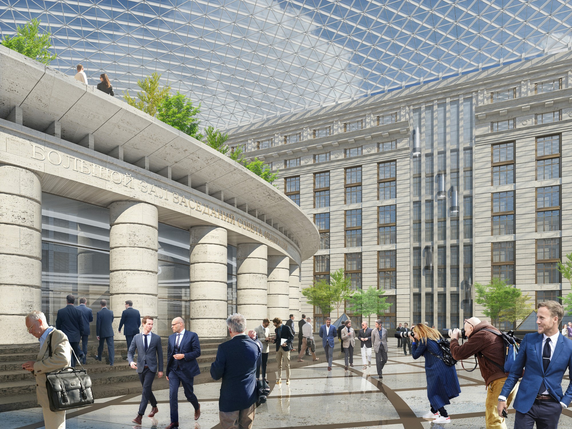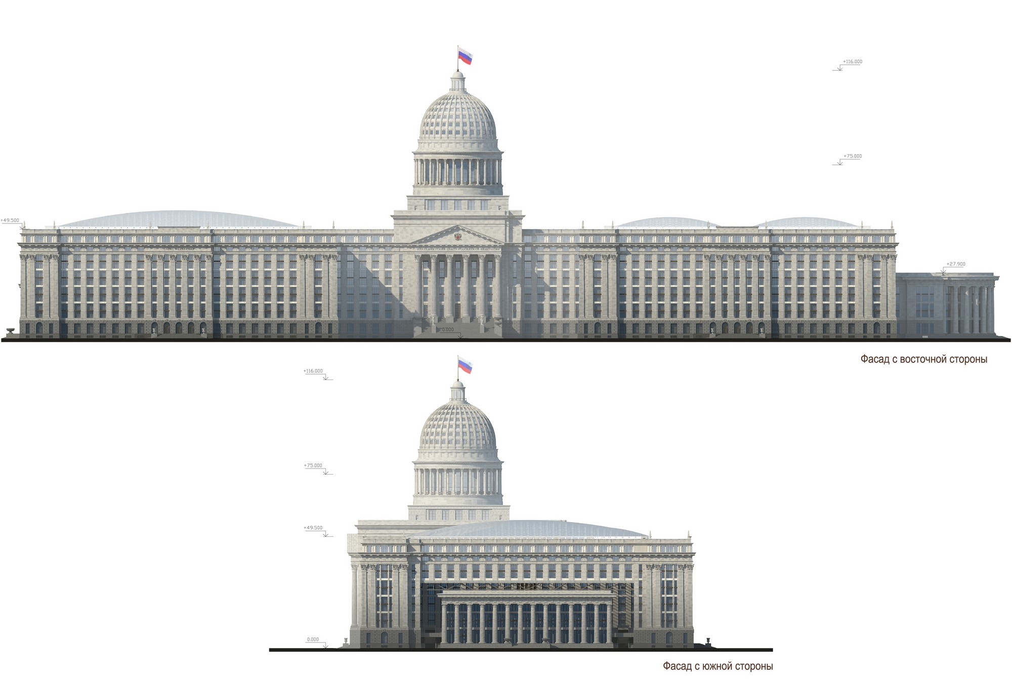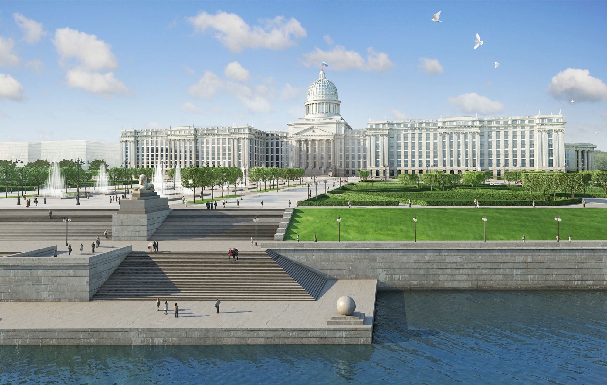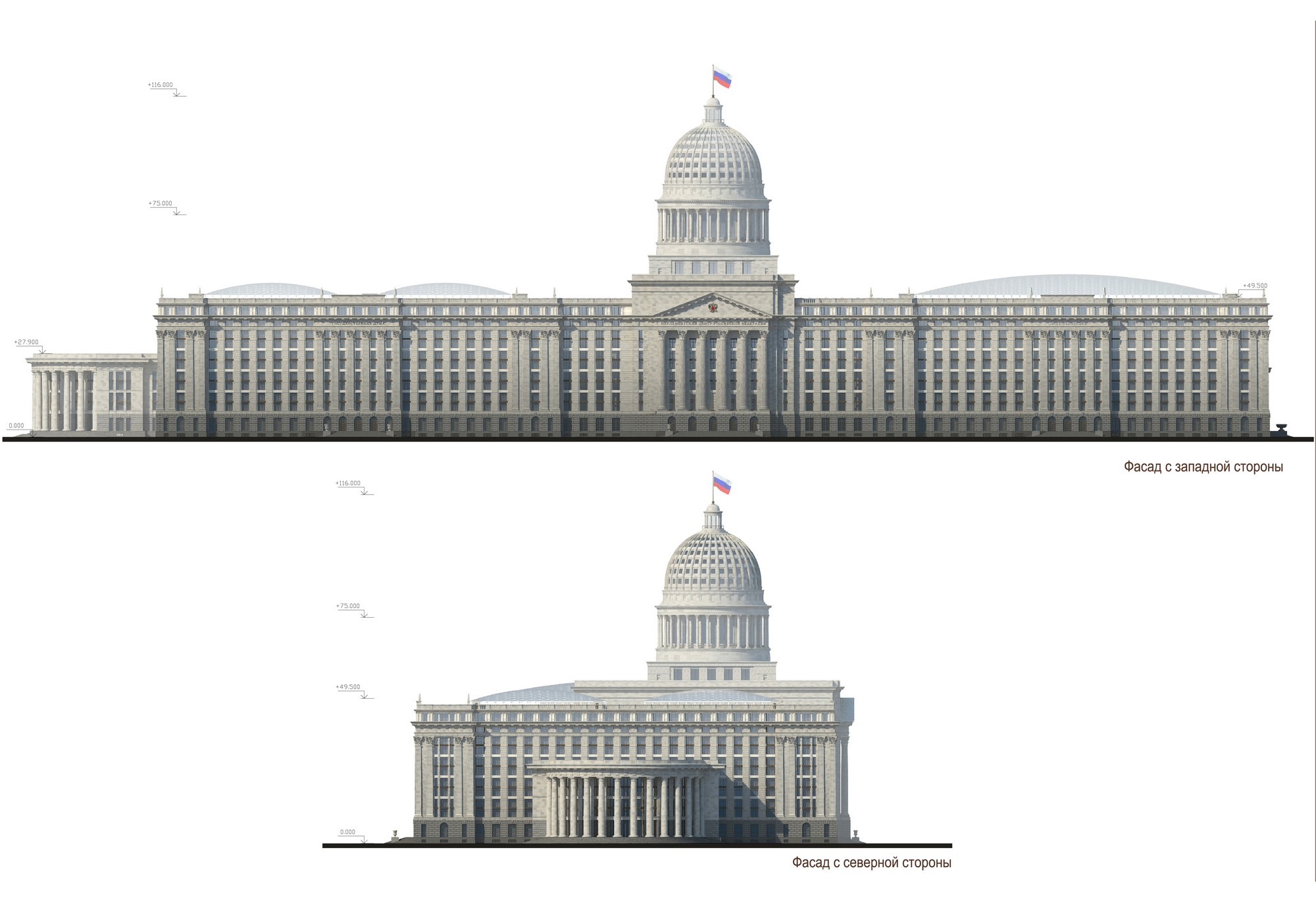 The contest for the Parliamentary Centre of the Russian Federation design was conducted in two stages. At each stage, the designs proposed by the Workshop reached the finals. This design was based on New Classicism as the most appropriate style taking into account the building’s function.