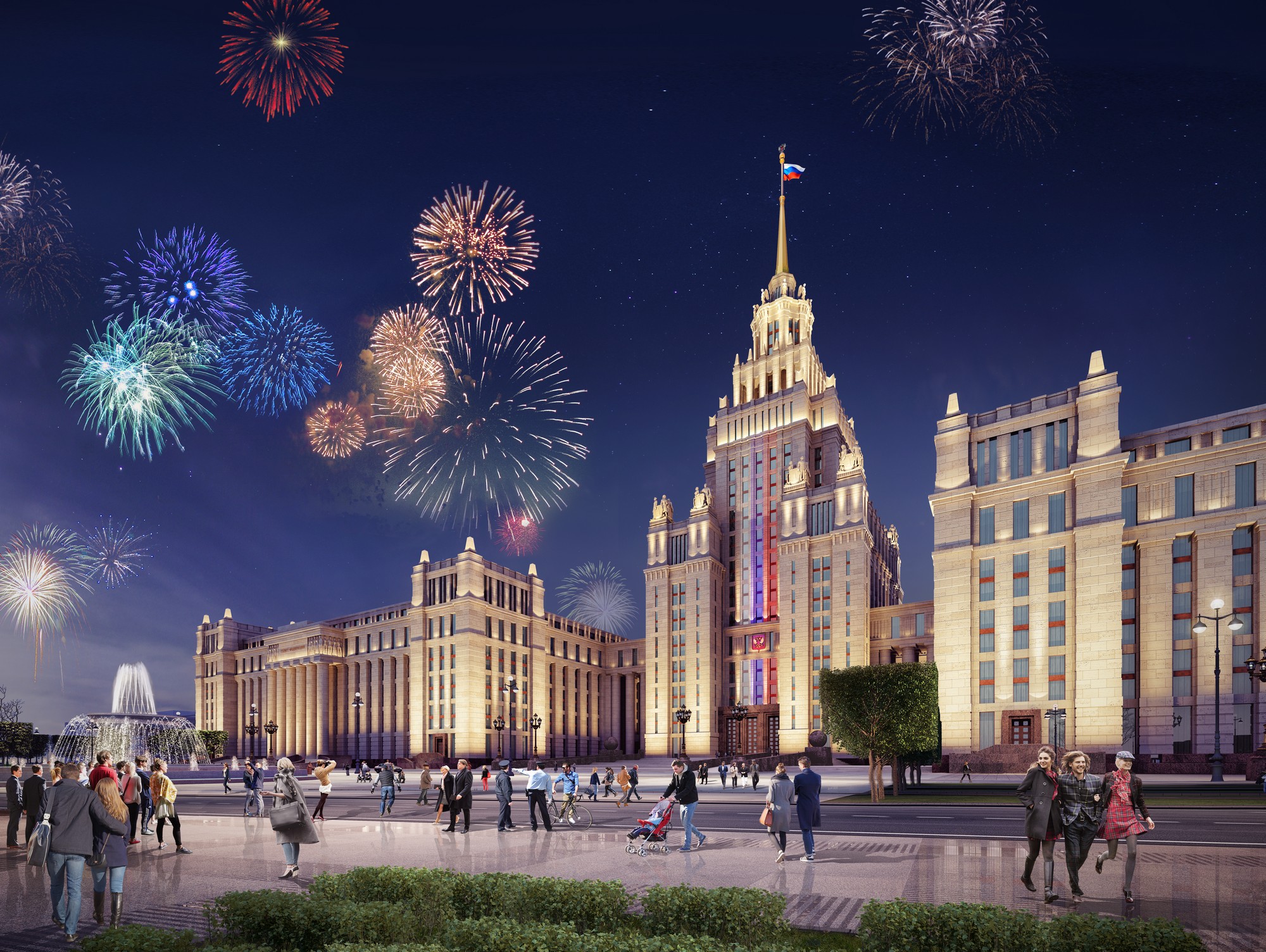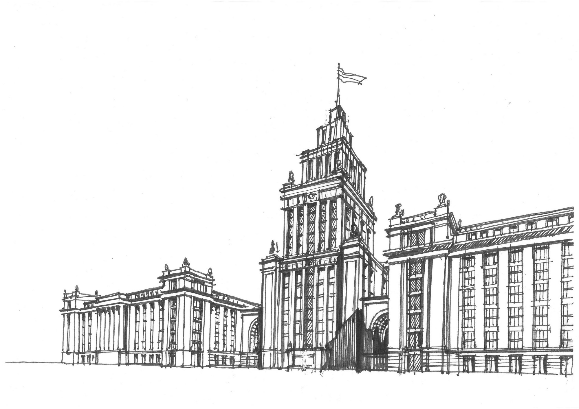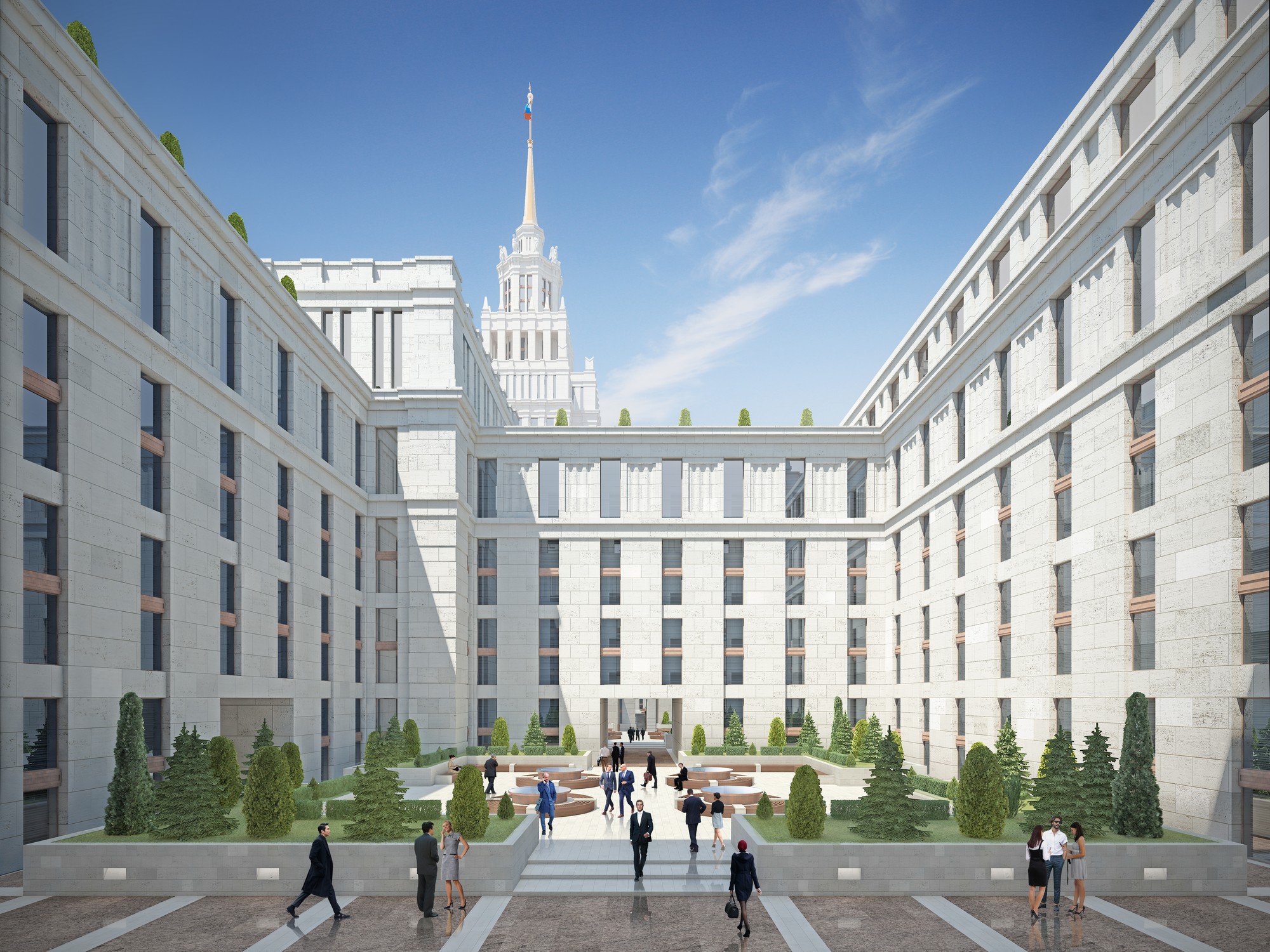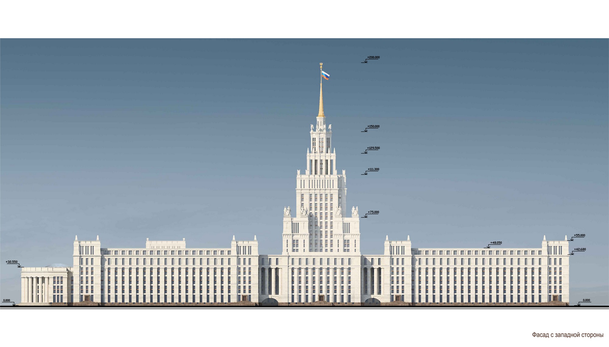The second version of the contest design for the Parliamentary Centre is also New Classical in style. While in the first draft the composition was dominated by the dome, the second draft is focused around a turret, which by its architecture resembles Stalin’s Empire style. Façades design is more laconic, and also includes a modern version of some neoclassical elements.