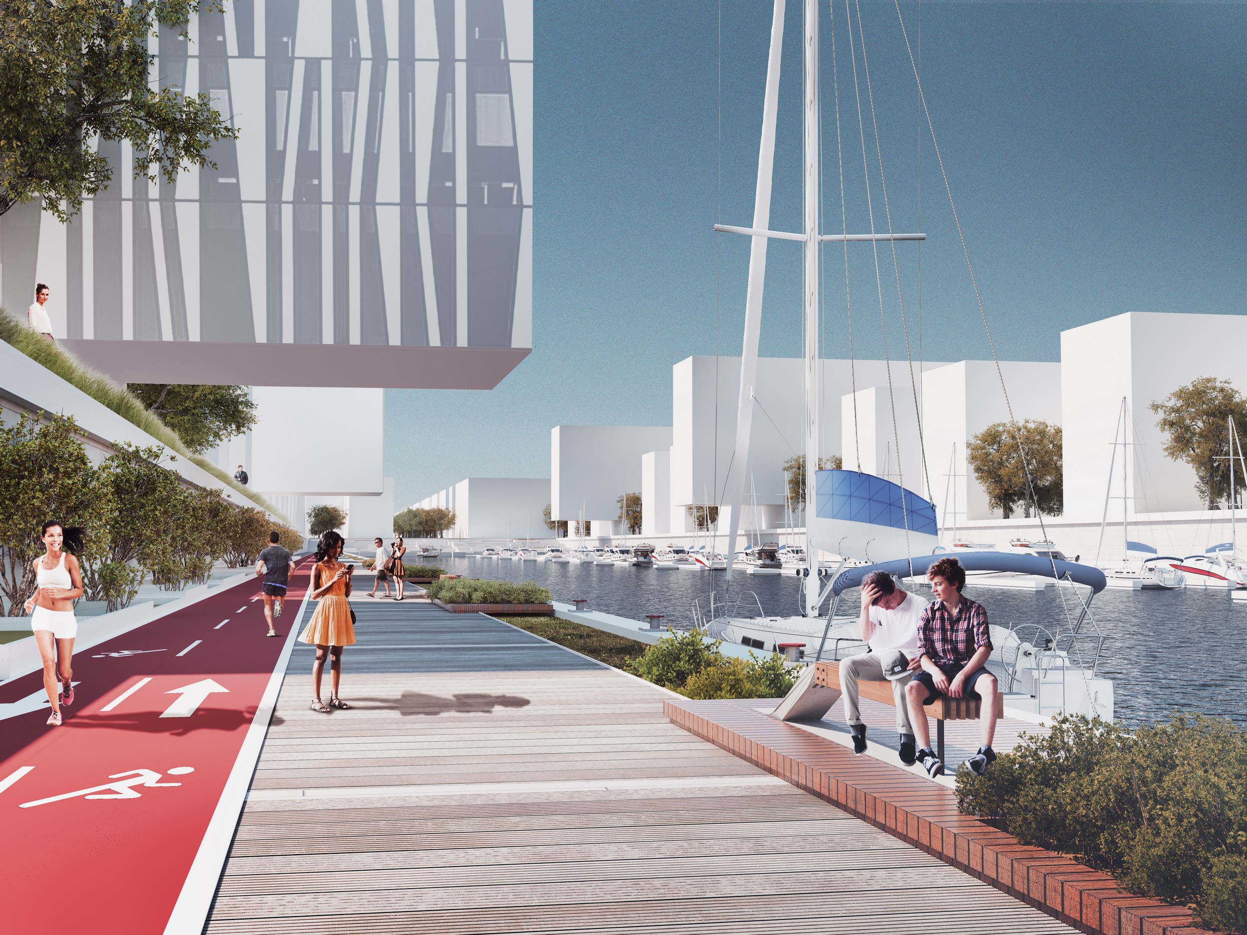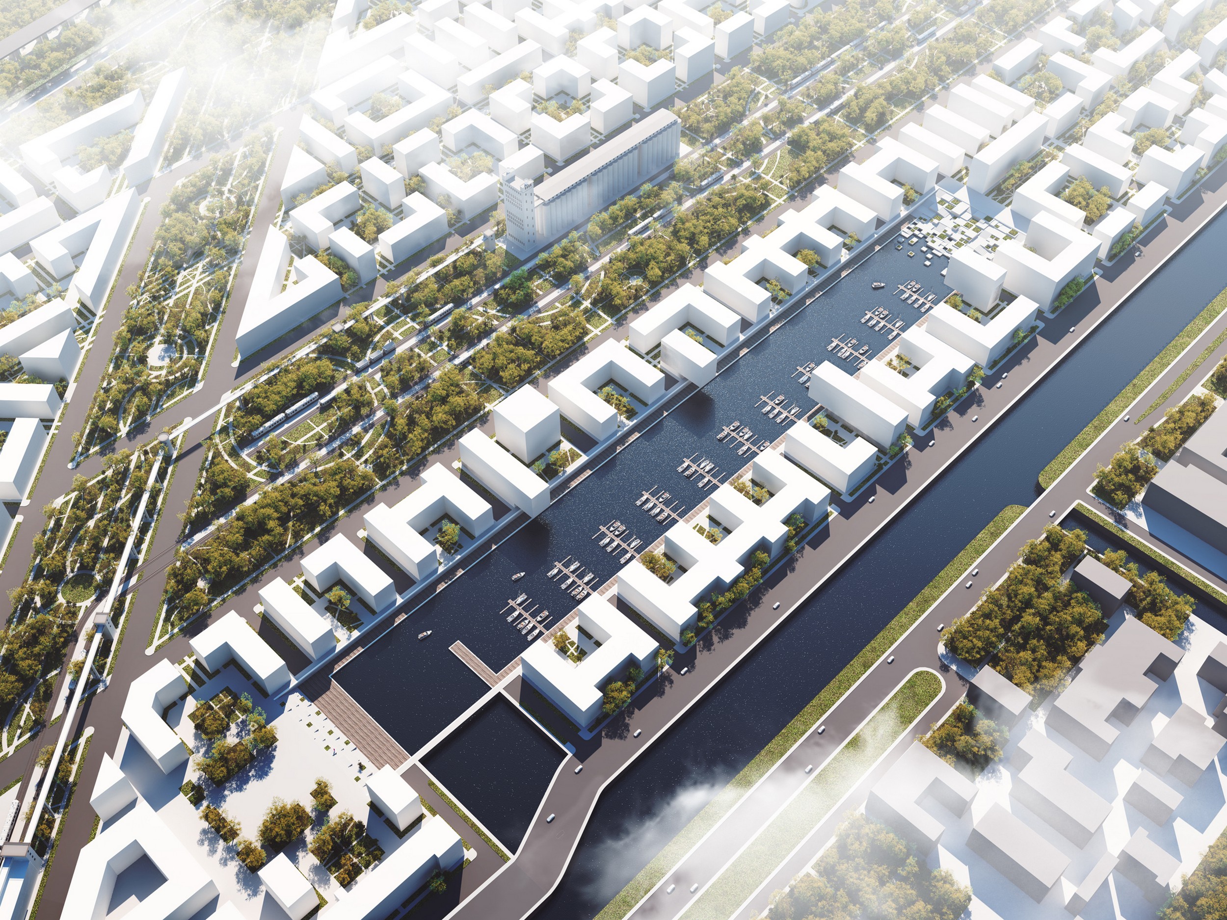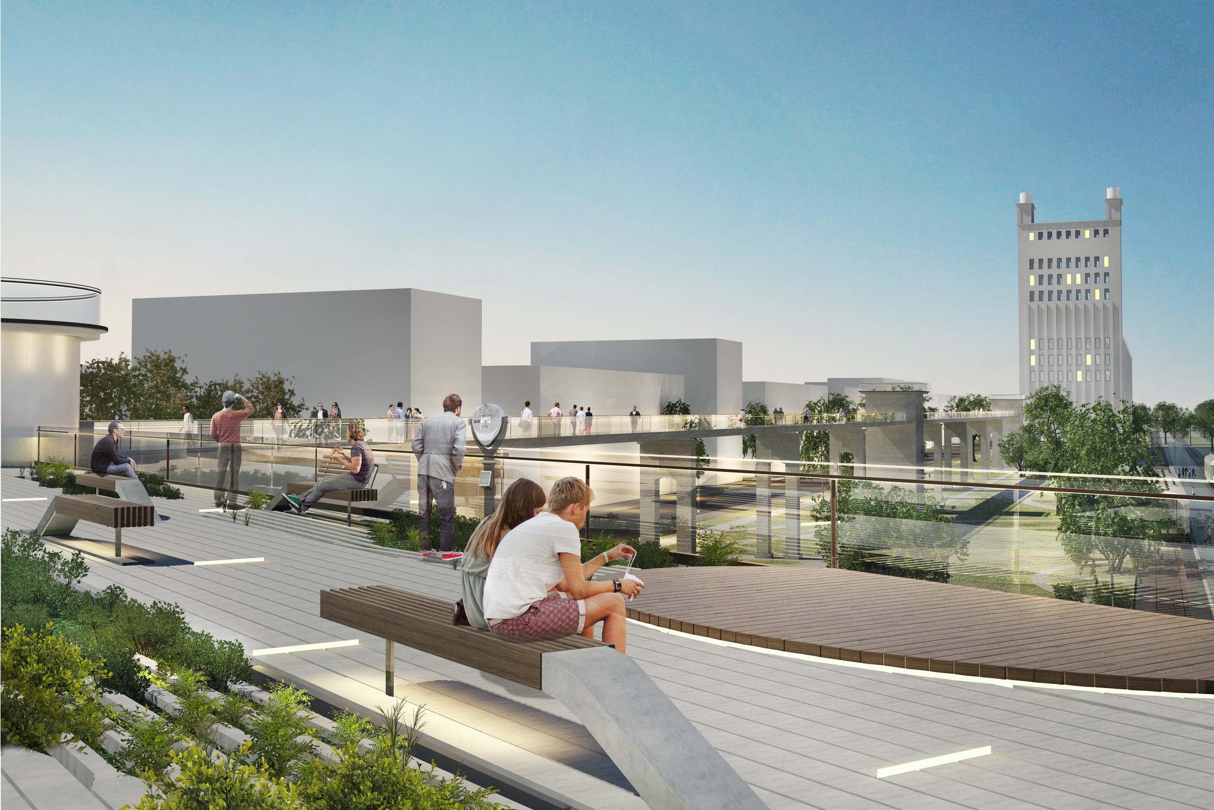 Residential blocks shall also be densely built-up; public buildings shall be evenly distributed amongst residential estates. Parkland shall be created along the railways connecting the elevator building and the milling facility, these two possessing a heritage site status. Two green areas stretched in two different directions shall become the primary elements of the area design. An important mission of the parks shall be a rethinking of the district’s industrial past: the railway lines, old rail cars, conveyor supports shall become objets d’art and constitute peculiar features of the area. Using concrete supports of the former conveyor, a promenade with an observation platform shall be constructed to provide for a prominent two-level structure of the park.