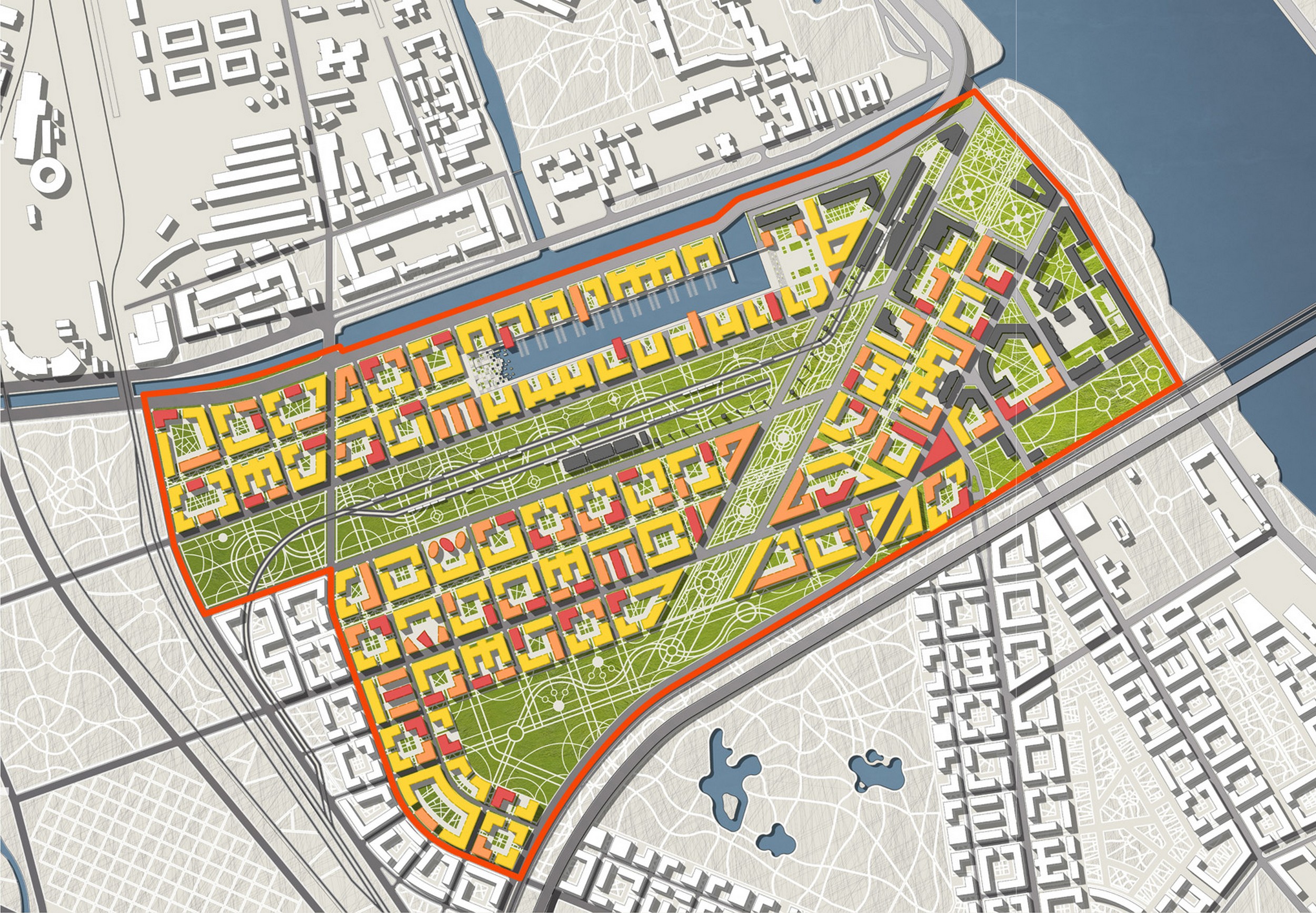The contest assignment comprised two parts. The participants had to present their approach to space planning development of a plot of about 4,000 ha (almost 10,000 acres) located between the Ekateringofka river in the west and the Neva river in the east. Within these boundaries, three «pilot» plots were designated, of about 100 ha (250 acres) each. As a result of drawing lots, the area of the Frantsuzsky Kovsh blind canal was assigned to the Workshops consortium as the contest project area. The resulting design has won the 1st place in the contest.