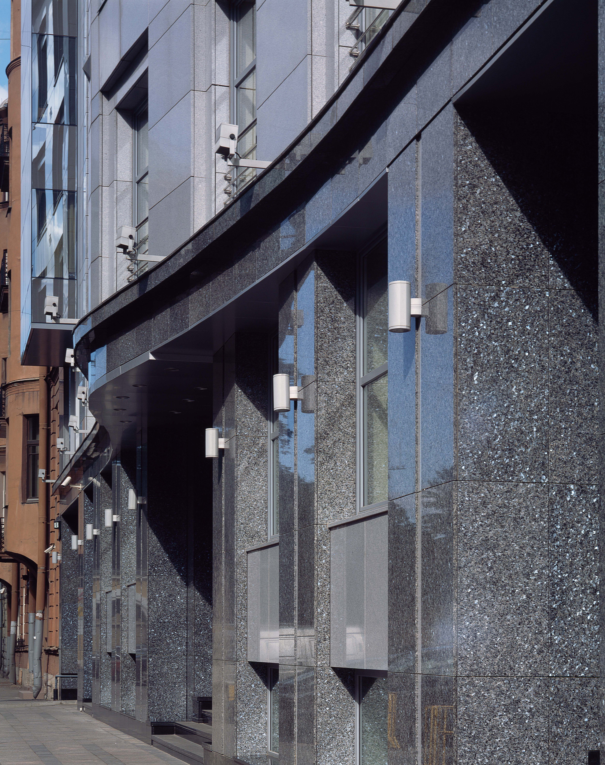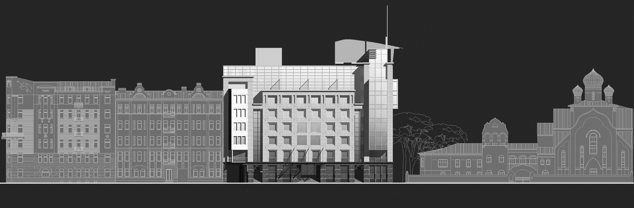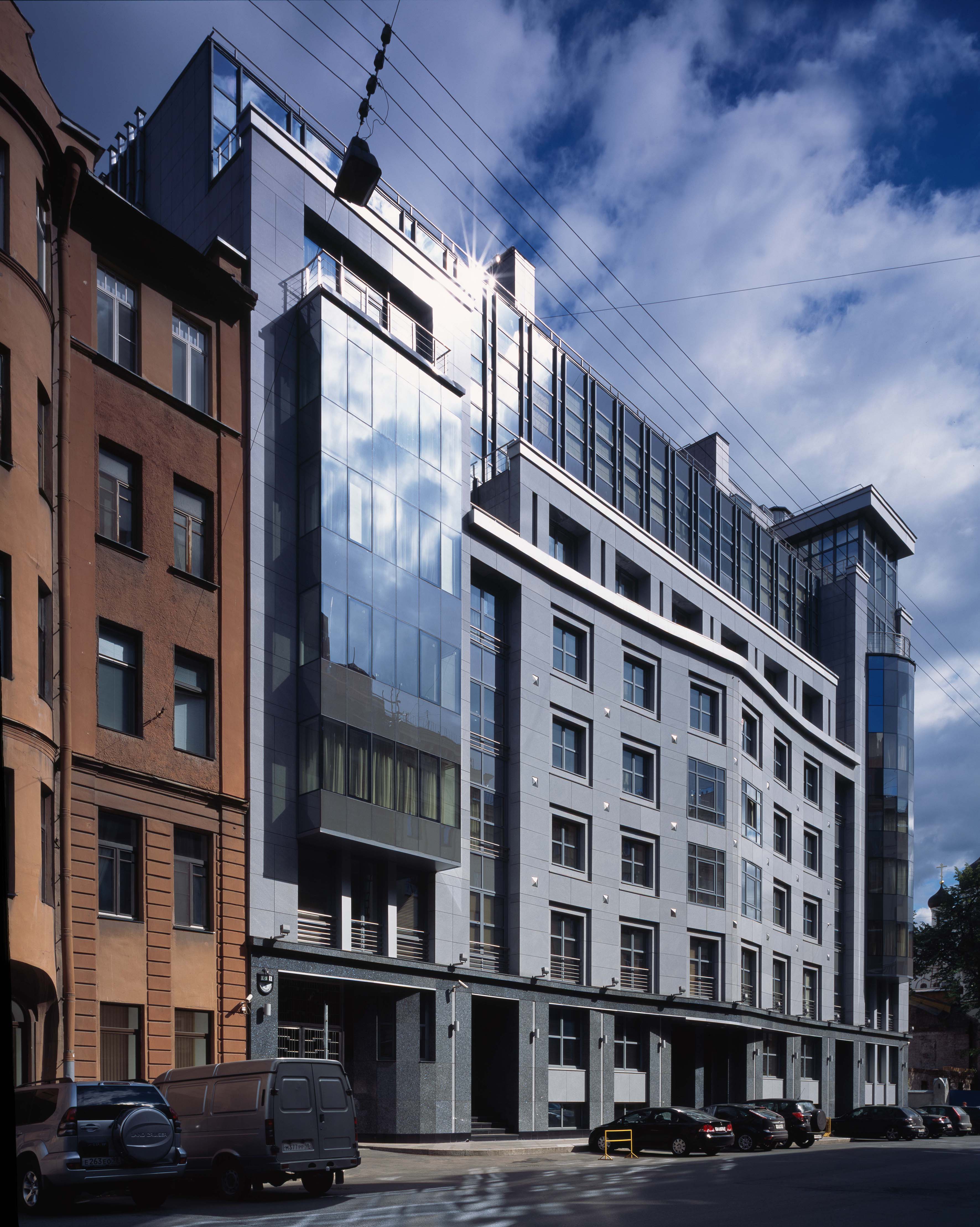 The laconism and dynamism of the composition give the building a modern scent and allow to integrate it into its environment, which has been formed at different times and is eclectic. The style of the building is a junction of modernism and classicism, thus allowing to introduce it into its historical architectural context as delicately as possible.