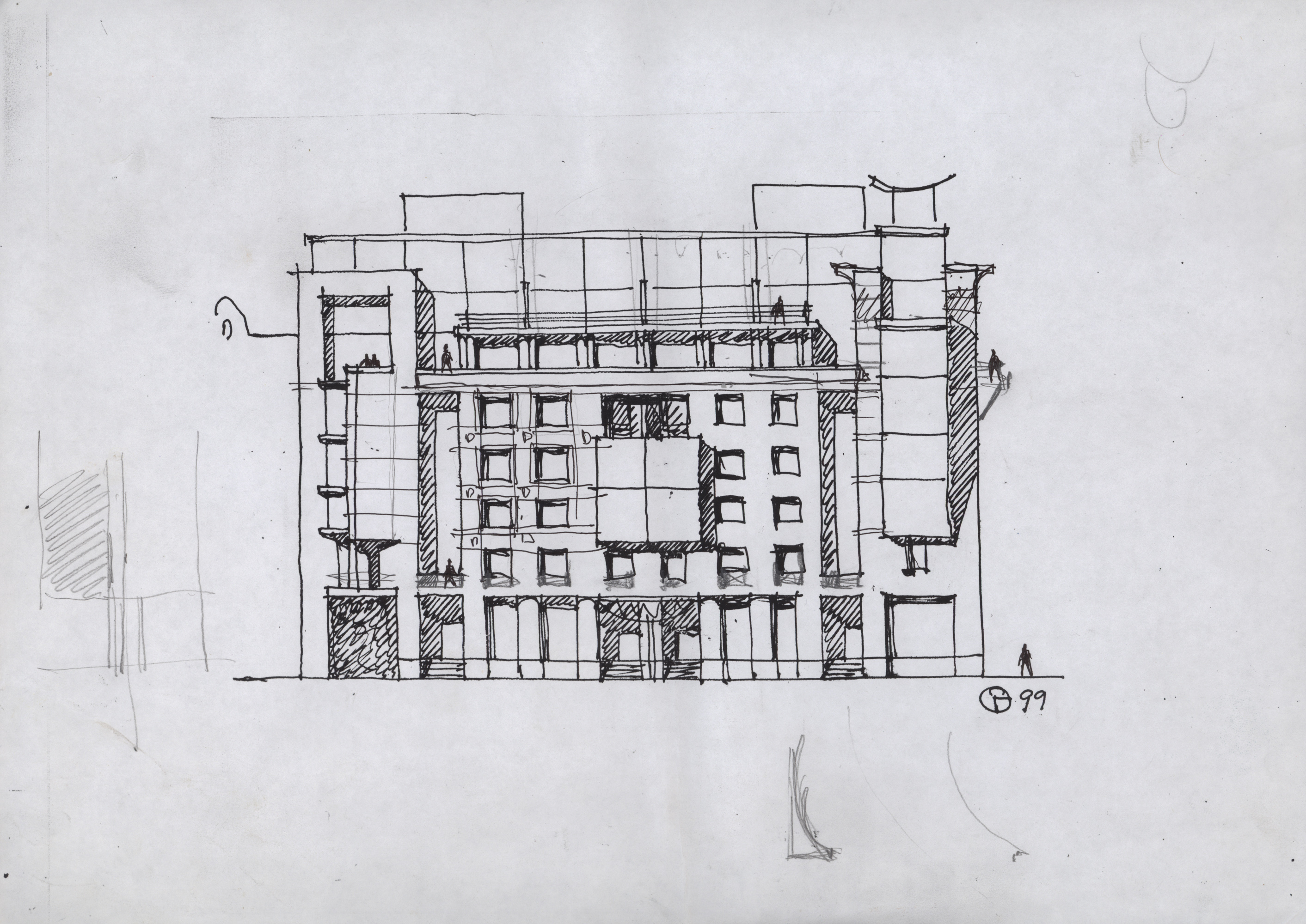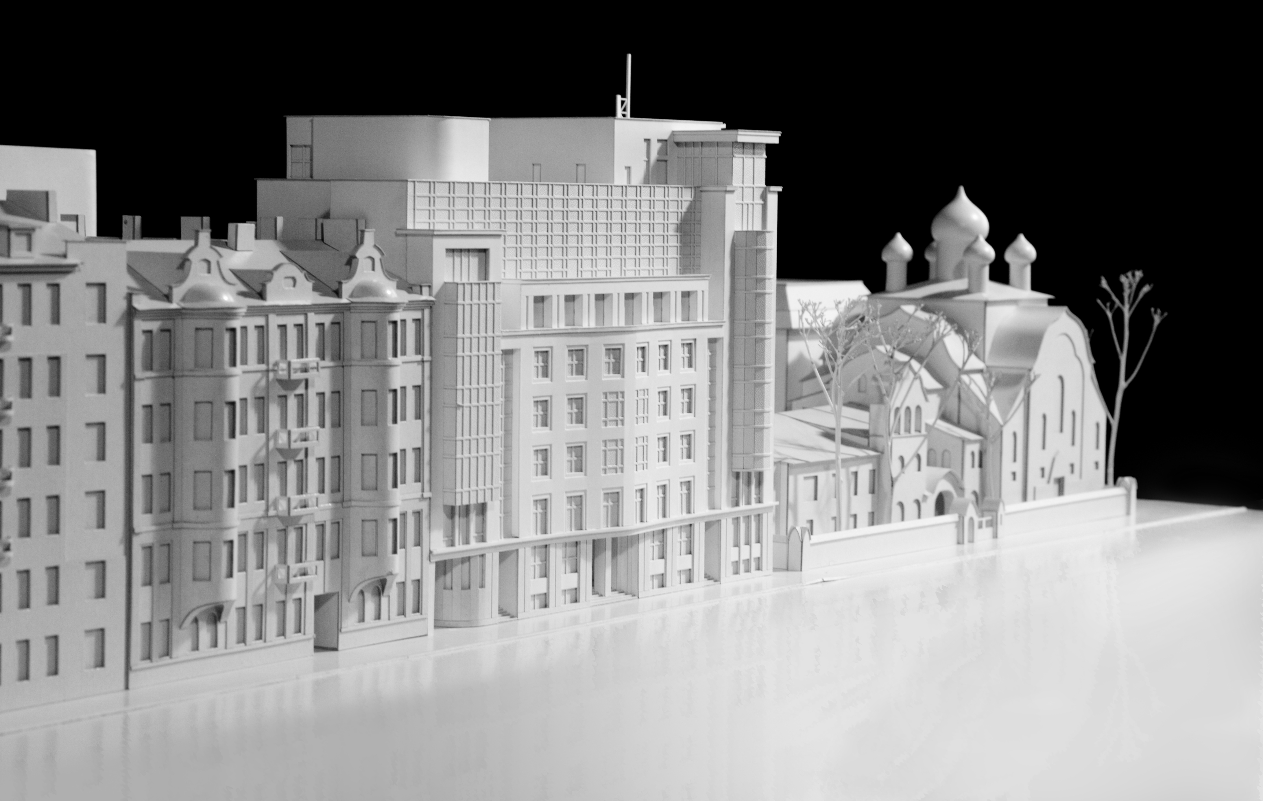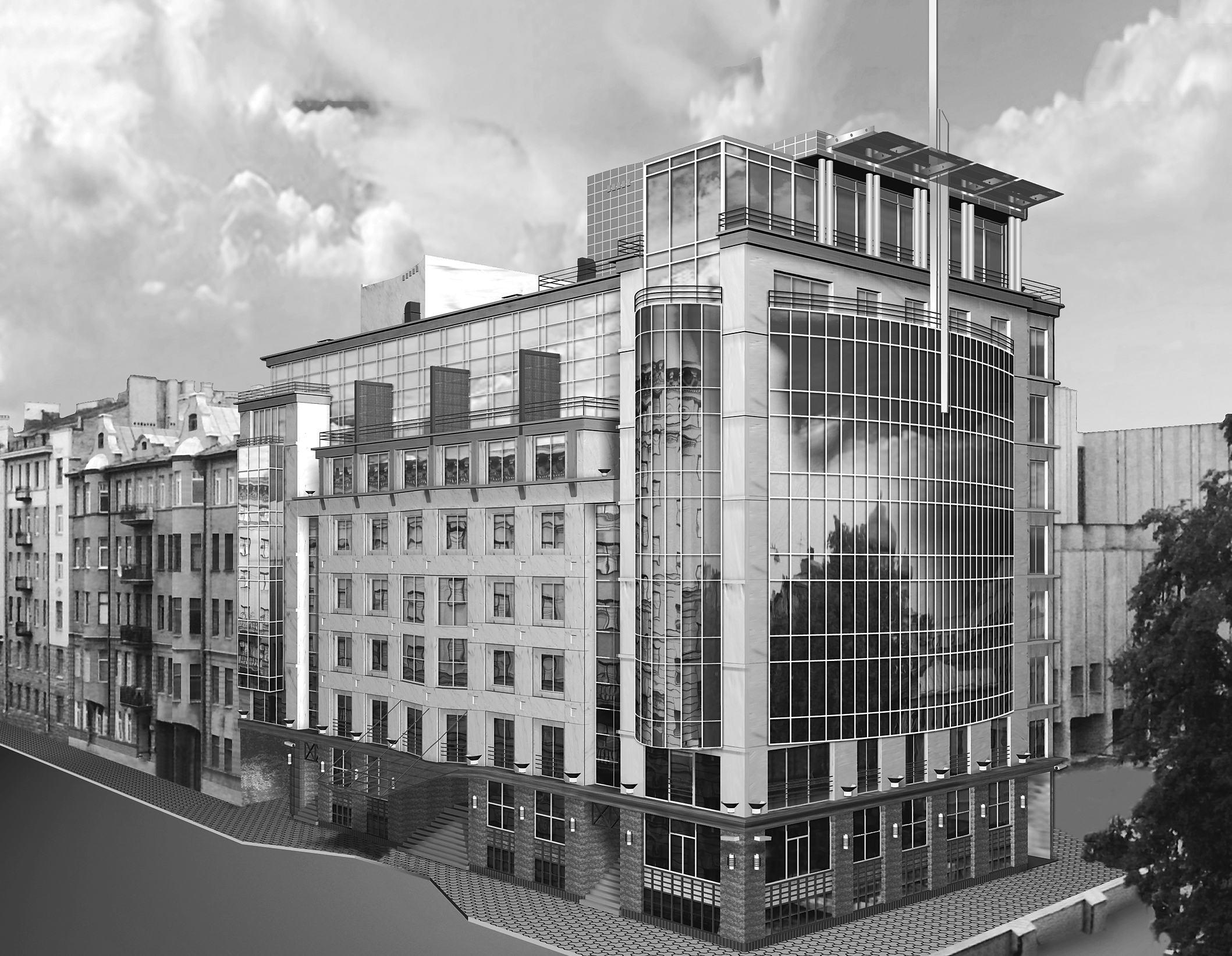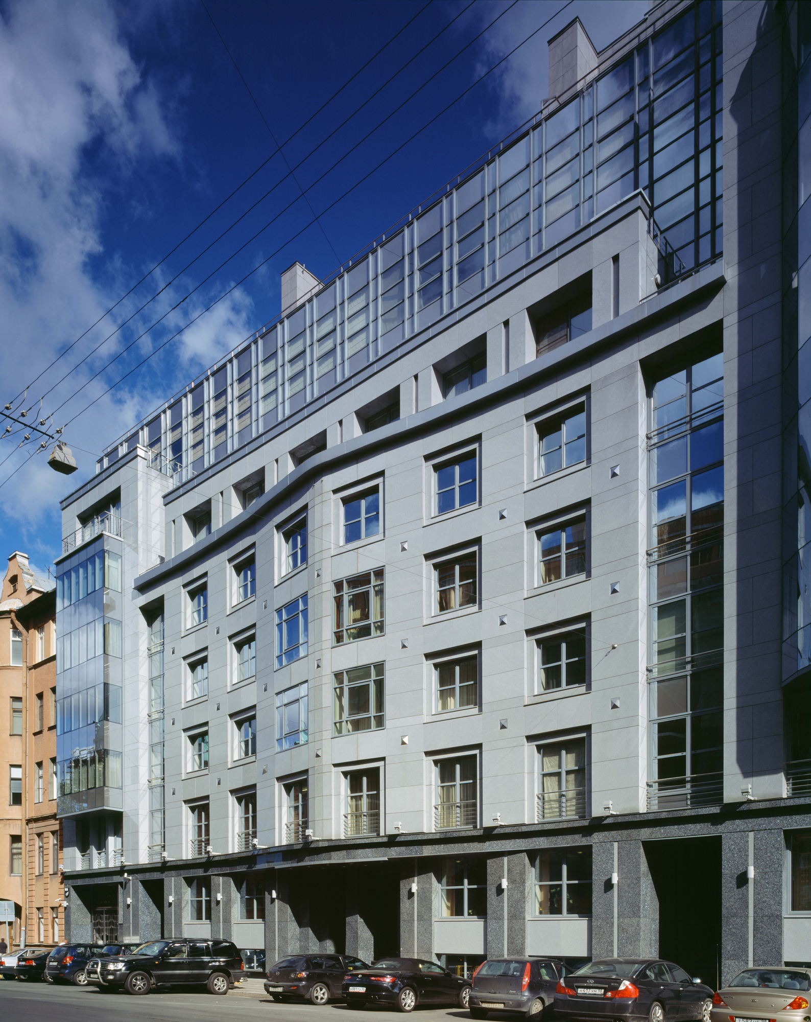 The laconism and dynamism of the composition give the building a modern scent and allow to integrate it into its environment, which has been formed at different times and is eclectic. The style of the building is a junction of modernism and classicism, thus allowing to introduce it into its historical architectural context as delicately as possible.