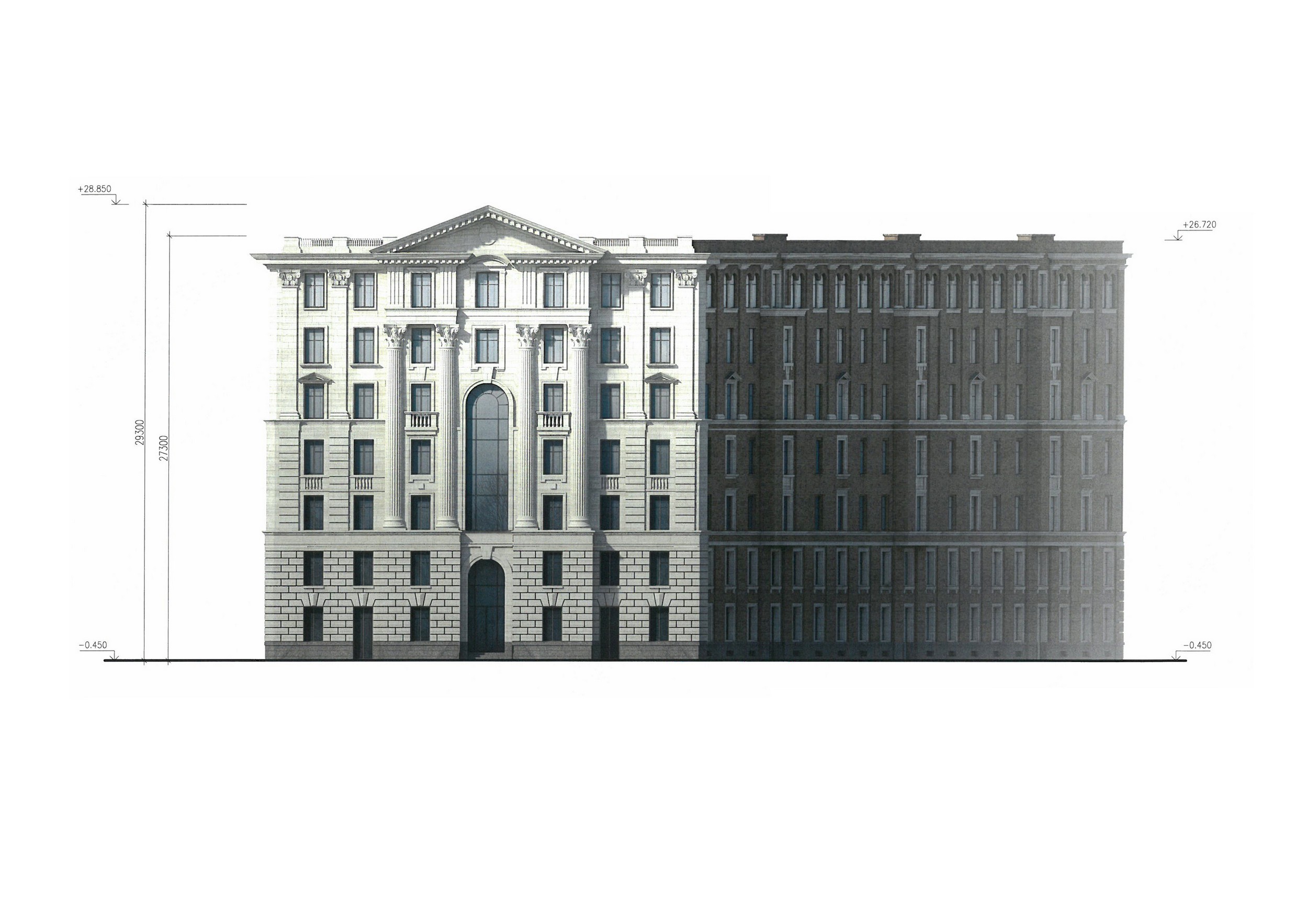 The dimensional and sculptural solution creates a relationship between Verona and the Renaissance palazzos of Northern Italy. The main façade finish is made of natural stone and emphasized by a porch with four Corinthian columns.