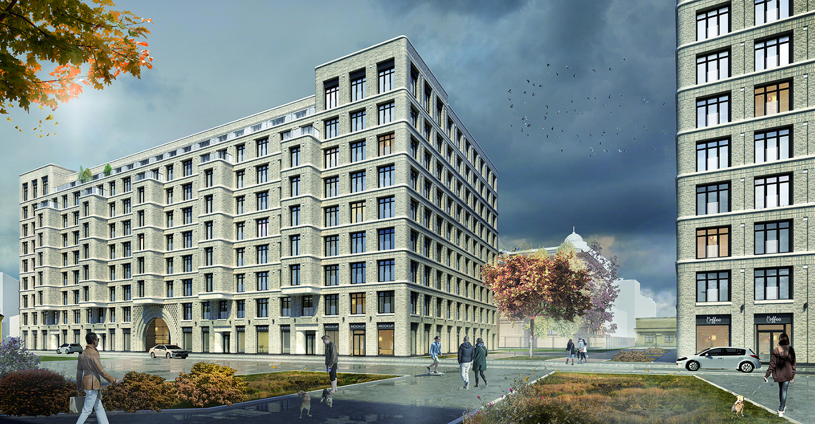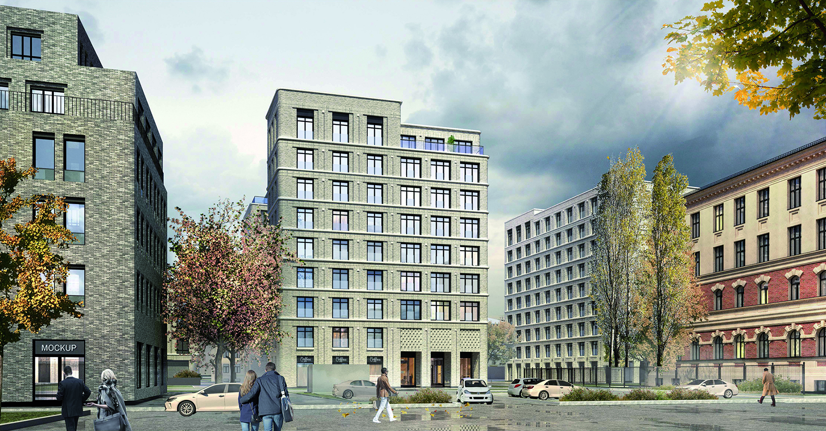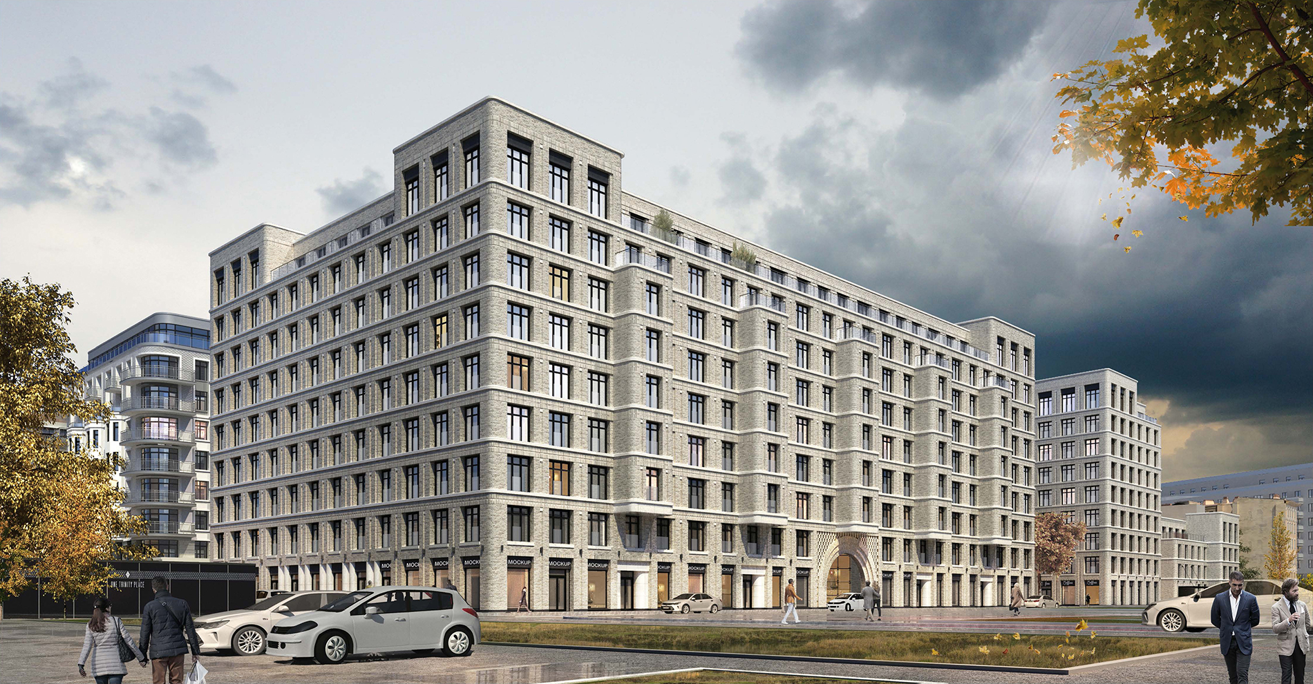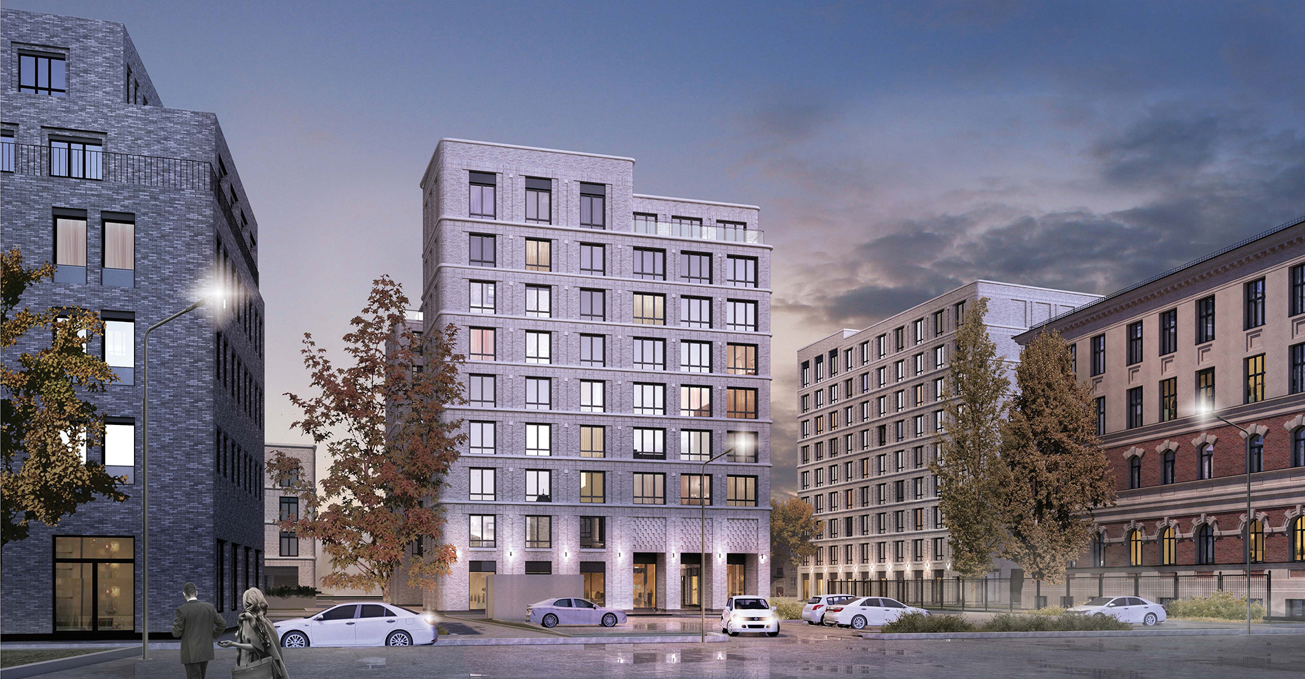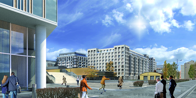 Our new residential complex commissioned by RBI represents three well-defined geometric volumes: 5, 9 and 9 floors. The unity of the buildings can be traced in the smooth rounded corners, vast terraces and light colored brick facades. The geometric simplicity of the facades is emphasized by rows of large windows, smooth horizontal ties and platbands.
