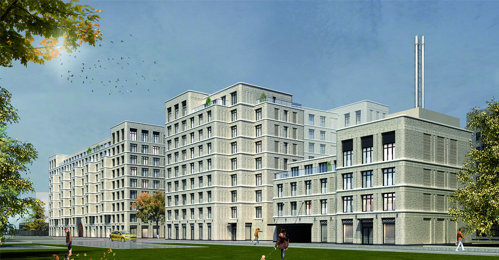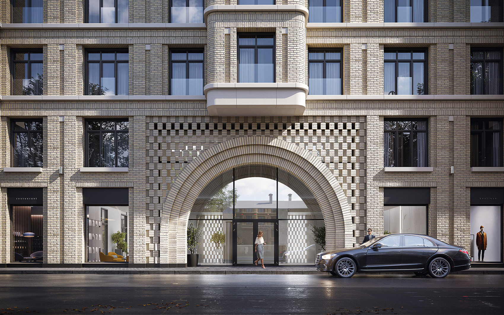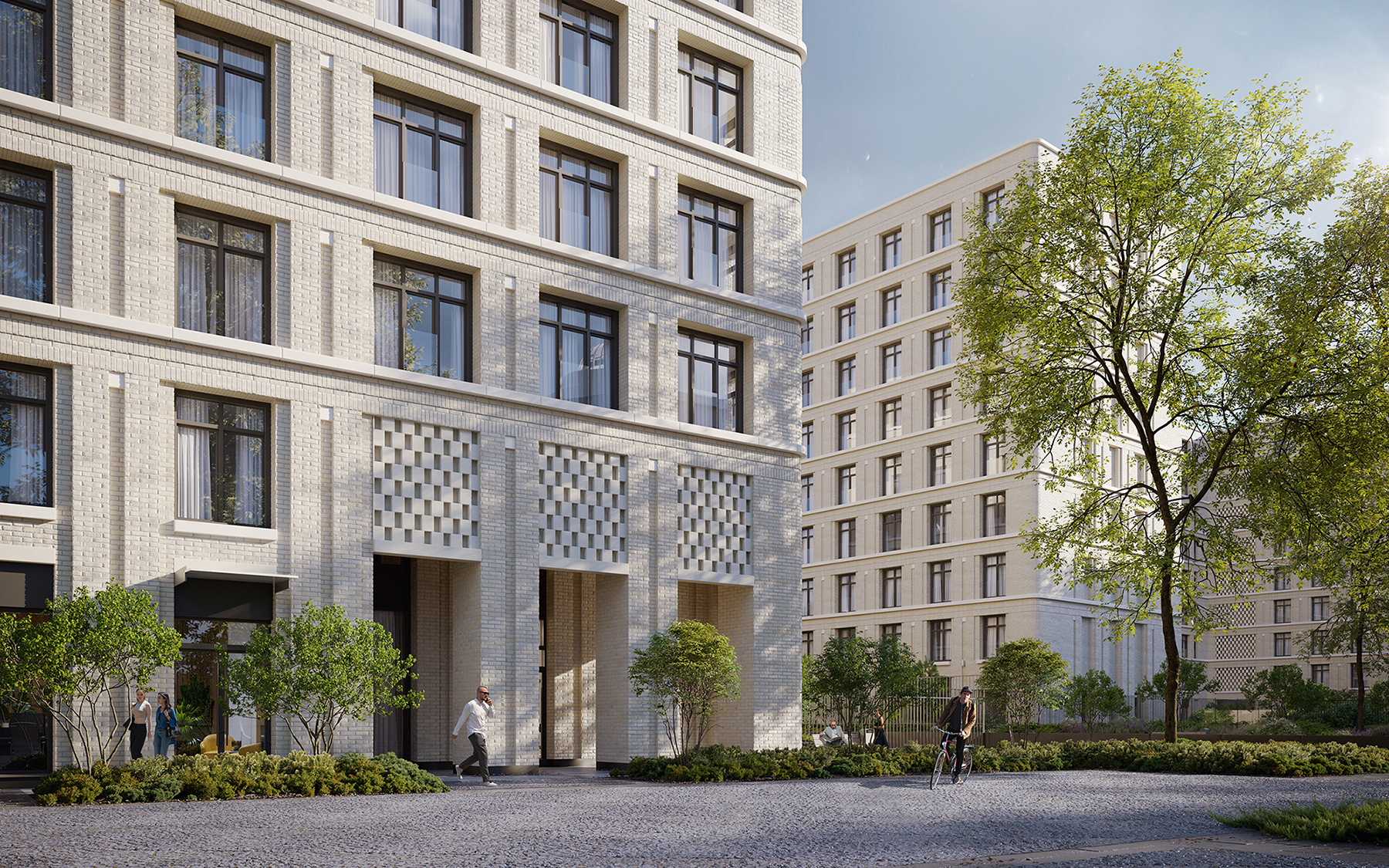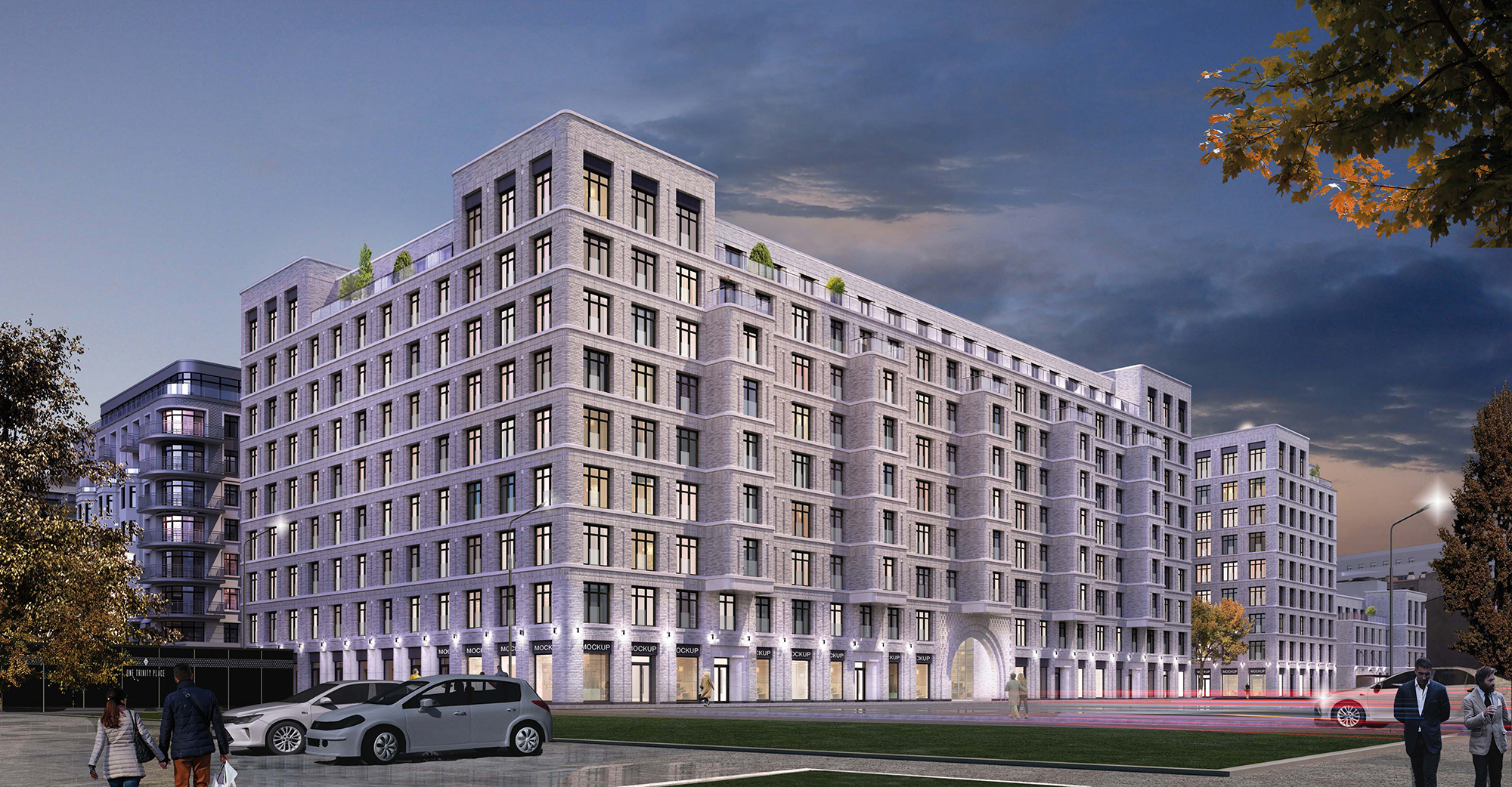 Our new residential complex commissioned by RBI represents three well-defined geometric volumes: 5, 9 and 9 floors. The unity of the buildings can be traced in the smooth rounded corners, vast terraces and light colored brick facades. The geometric simplicity of the facades is emphasized by rows of large windows, smooth horizontal ties and platbands.