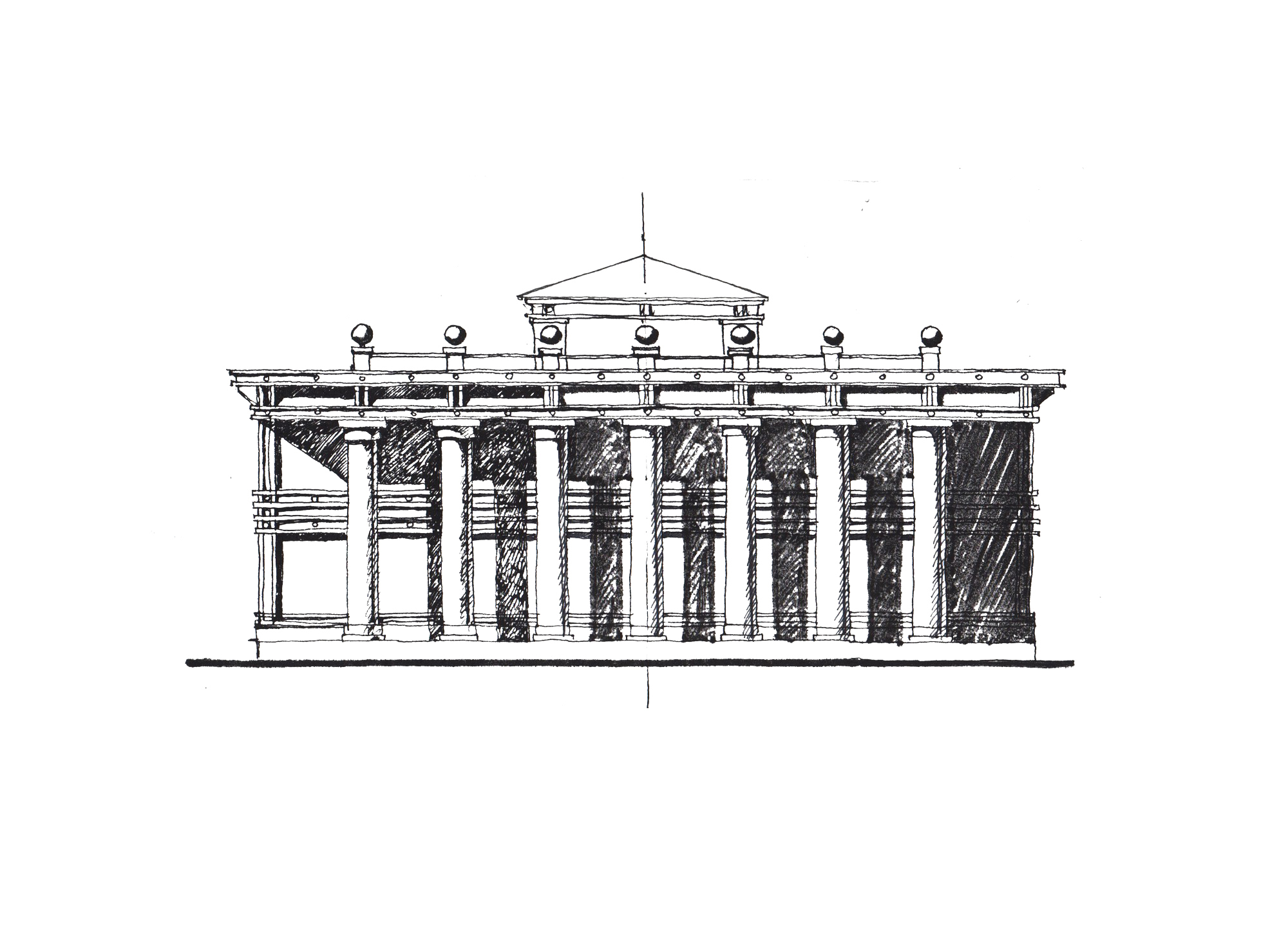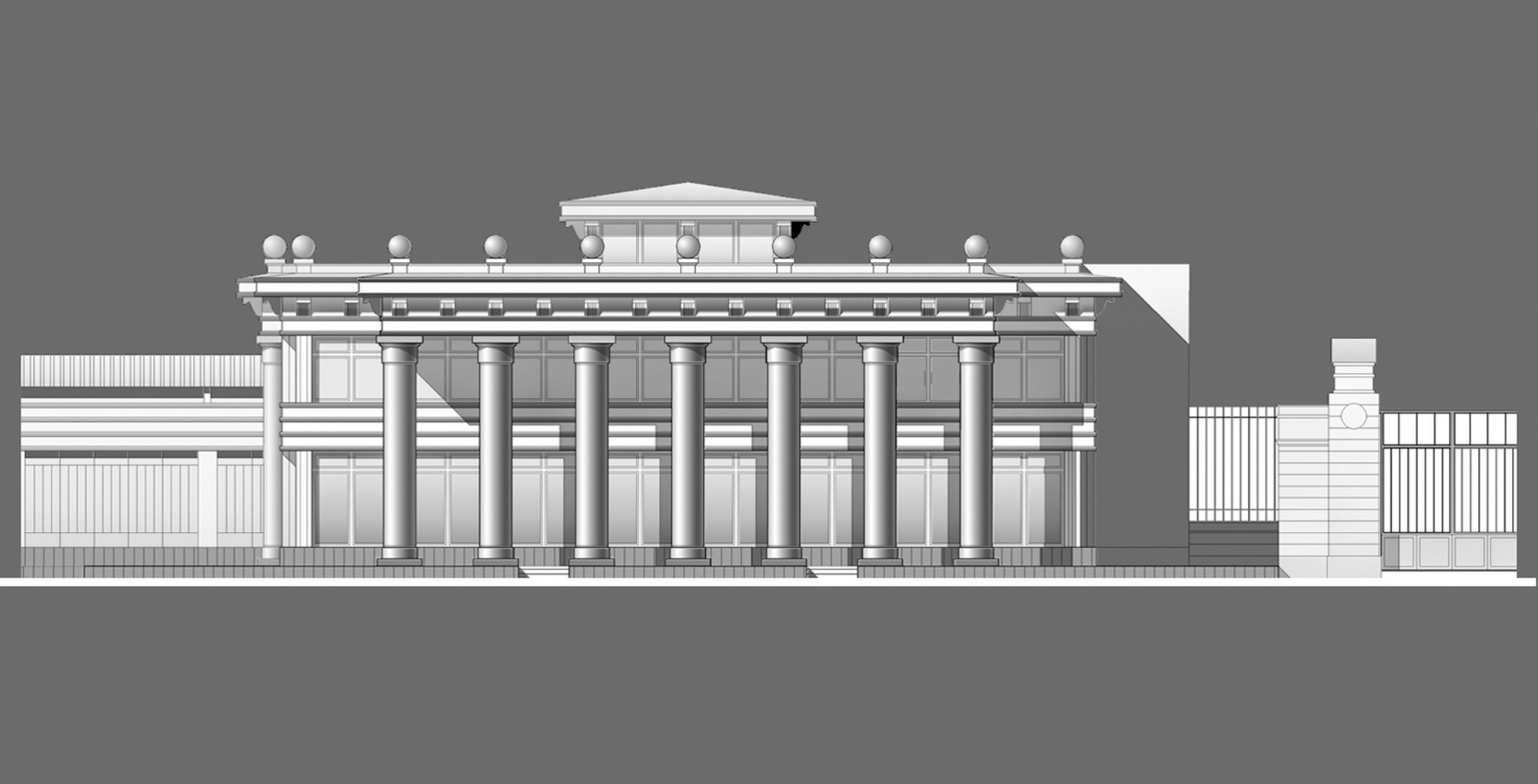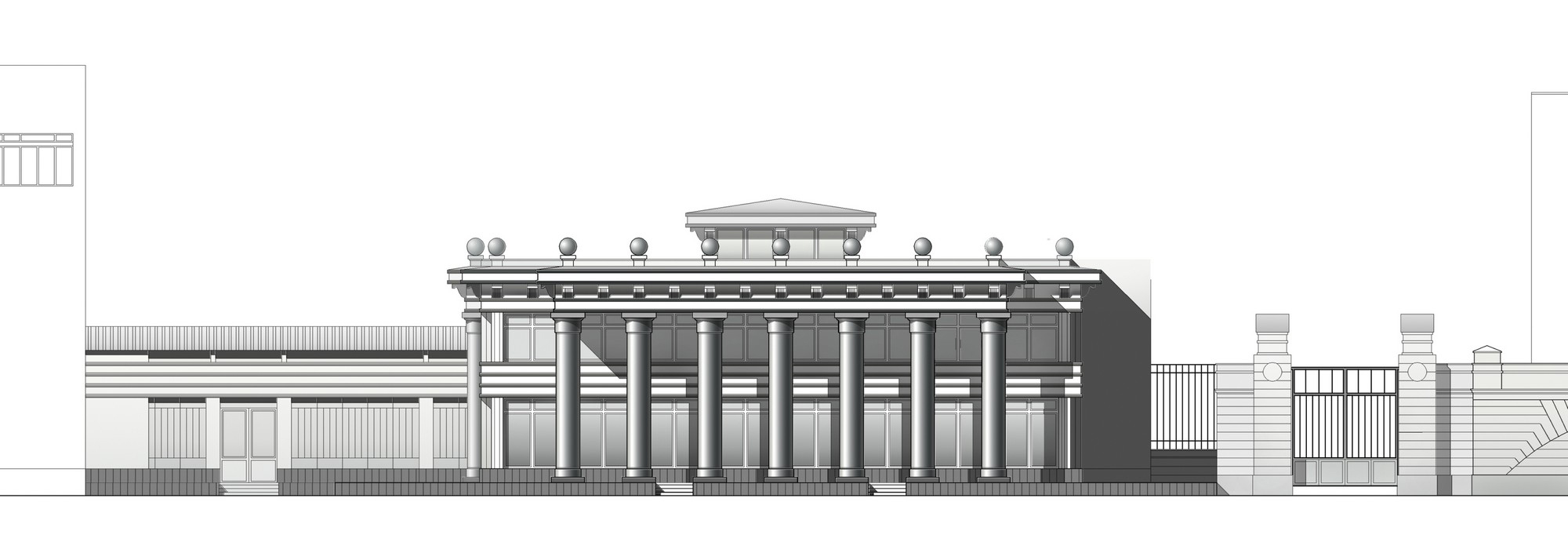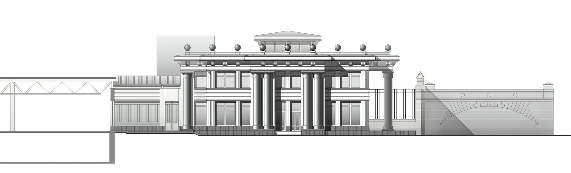 Выбор стилистики фасадов выставочного комплекса определило соседство с наземным павильоном станции метро «Кировский завод», возведённым в 1950-е гг. Лицевые фасады акцентированы массивными металлическими колоннами, а также деталями архитектурного декора, выполненными из чугуна.