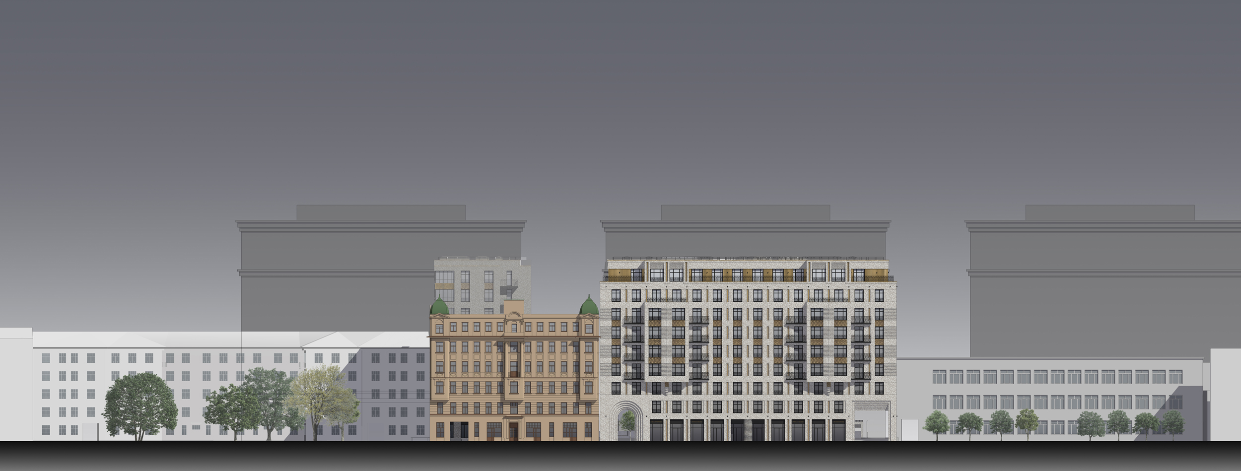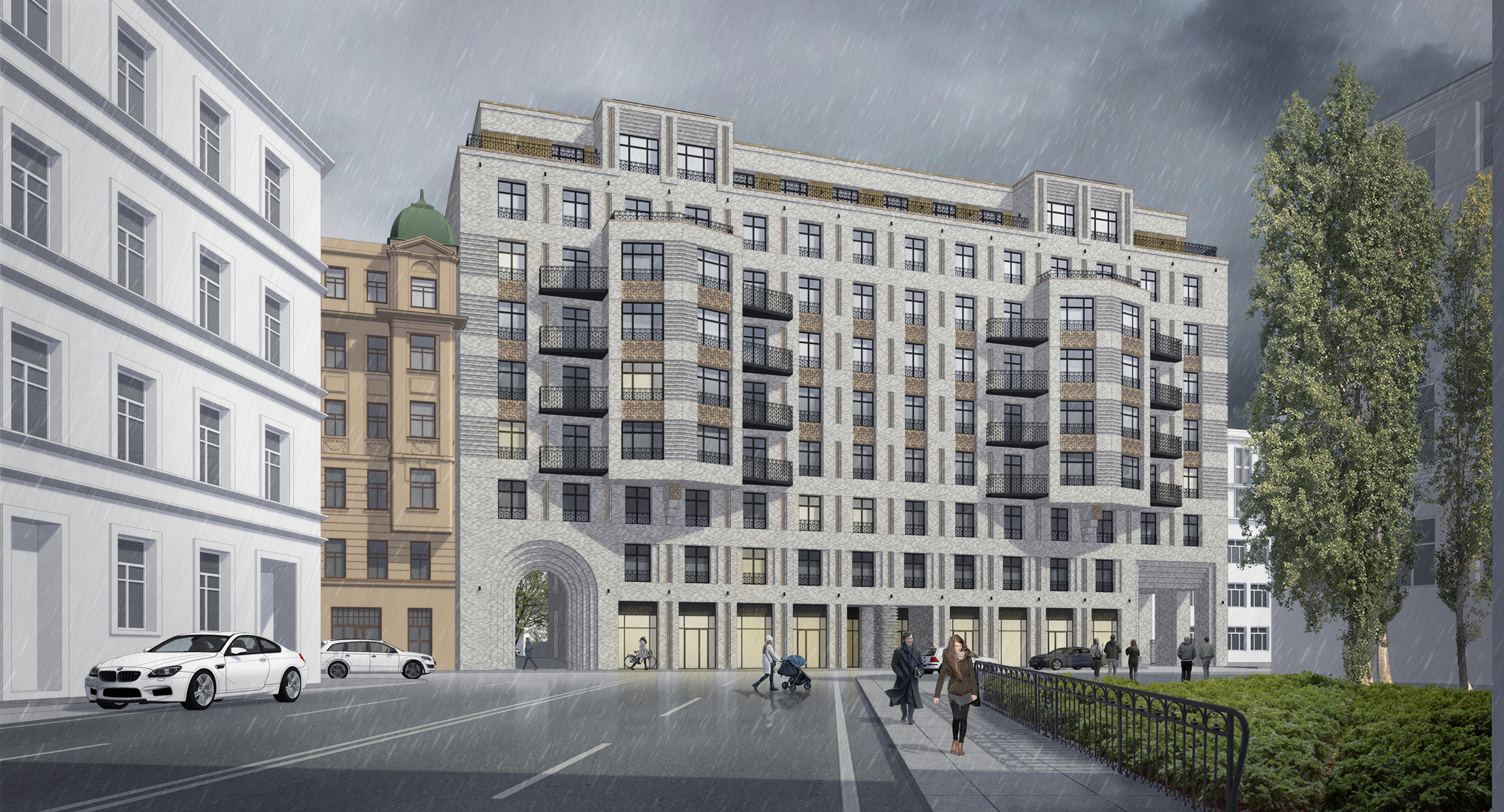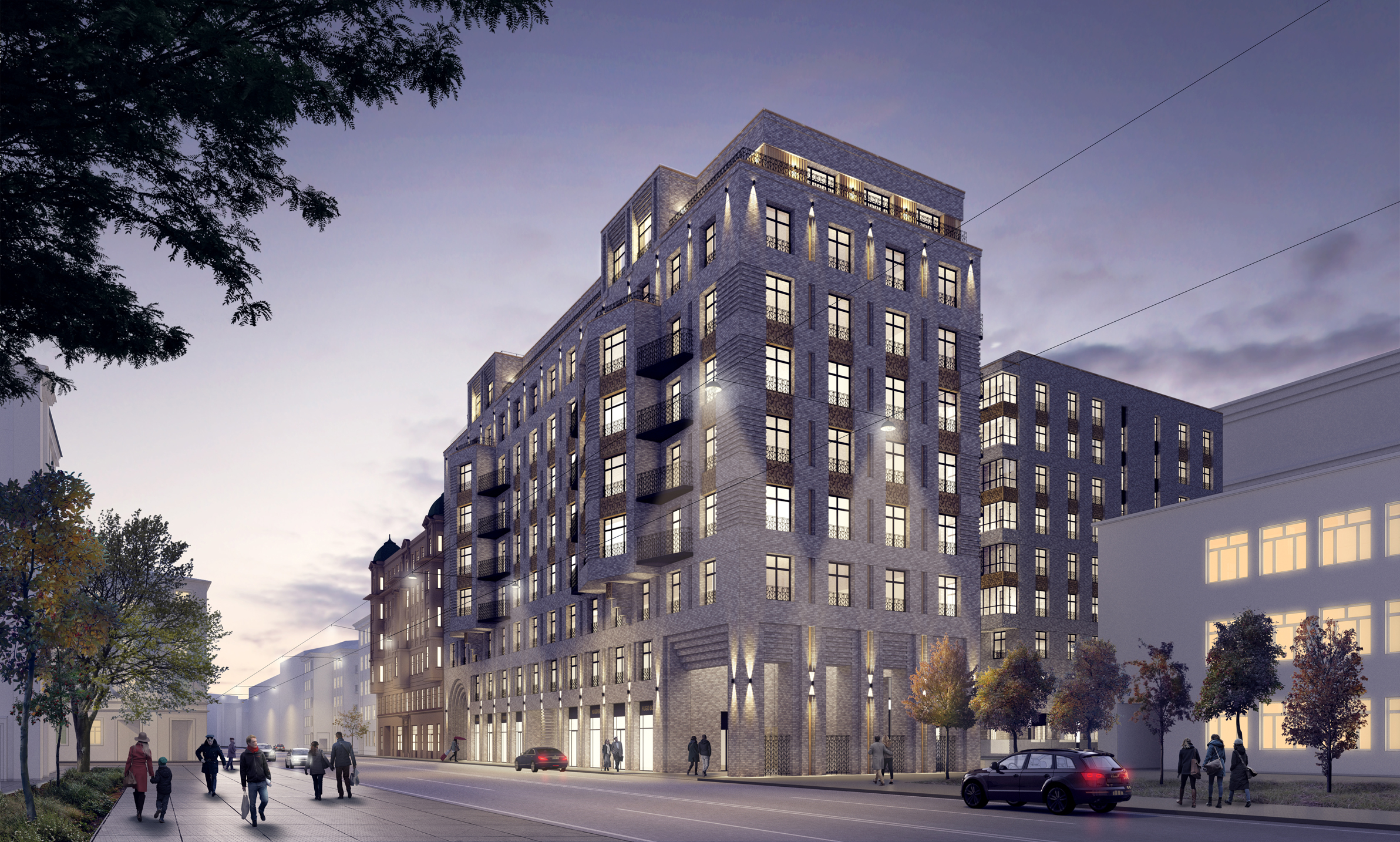 Основной принцип художественного решения фасадов – это создание образа сдержанной, монументальной фоновой жилой застройки высокого класса. Решенное в современных тенденциях здание, не нарушая среду культурного наследия, гармонично интегрируется в архитектурный облик Санкт-Петербурга.