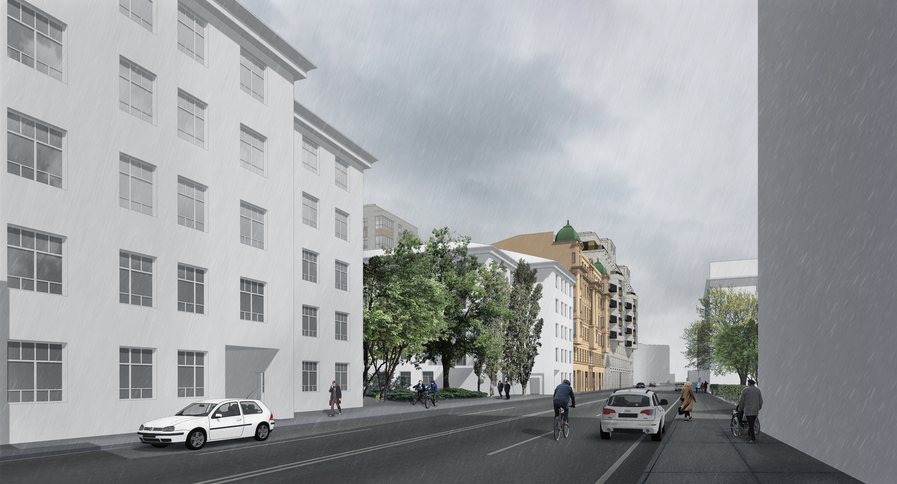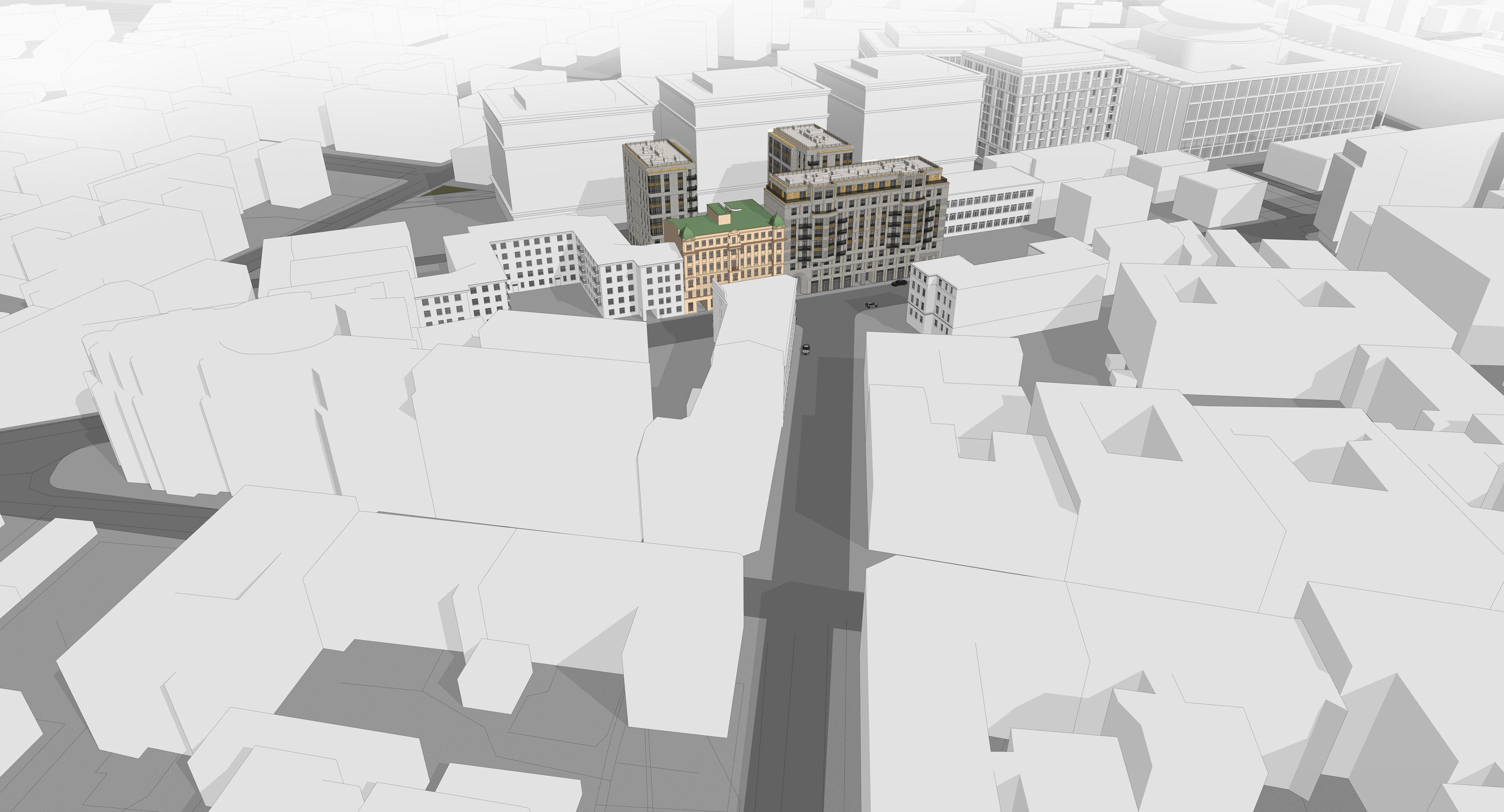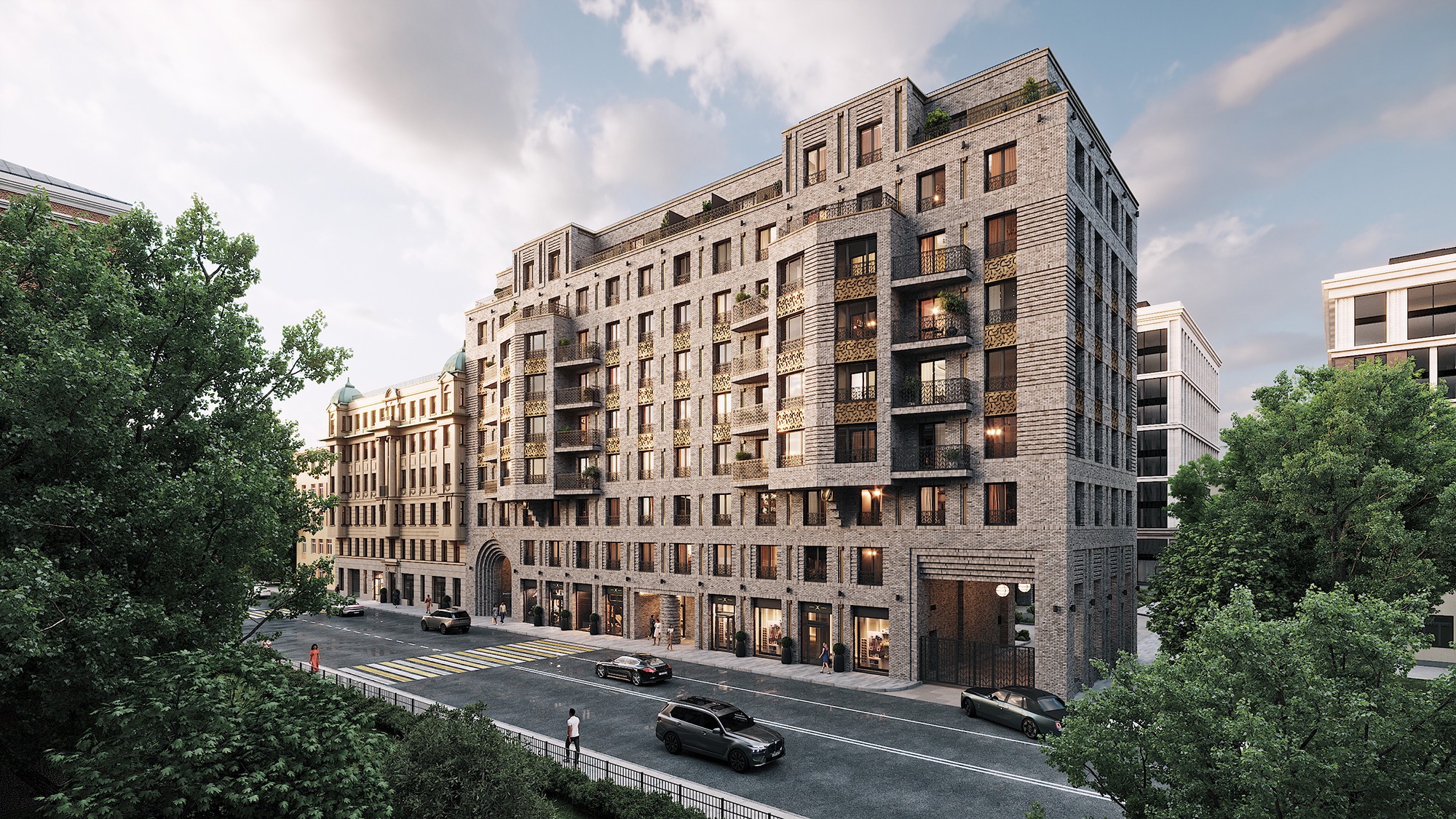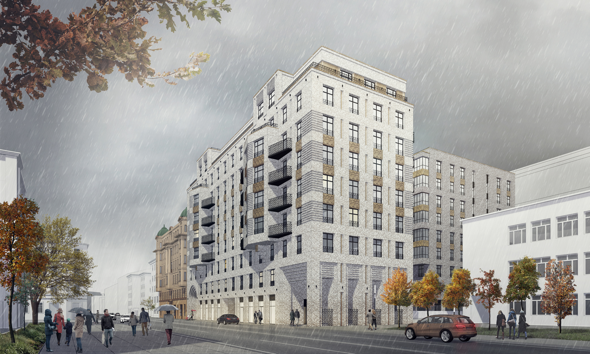 Основной принцип художественного решения фасадов – это создание образа сдержанной, монументальной фоновой жилой застройки высокого класса. Решенное в современных тенденциях здание, не нарушая среду культурного наследия, гармонично интегрируется в архитектурный облик Санкт-Петербурга.